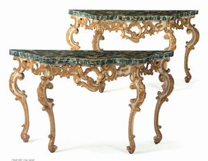 Coppia di consolles in legno intagliato, dorato, laccato e dipinto. Italia centrale, [..]