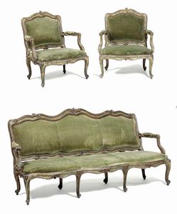 Set di un divano e due poltrone Luigi XV in legno intagliato, laccato e argentato. [..]