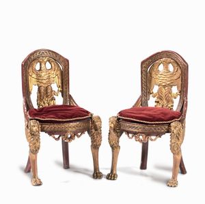 Coppia di sedie da parata in legno intagliato e dorato. Spagna (?) XIX secolo