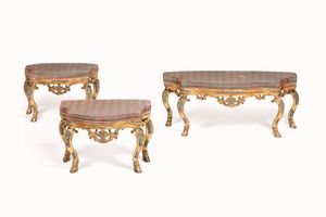 Tre panchetti in legno intagliato, laccato e dorato. Venezia XVIII secolo