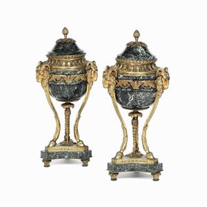 Coppia di cassolettes in marmo fior di pesco e bronzo dorato. Francia, epoca Napoleone [..]