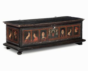 Cassapanca in noce dipinto. Toscana, prima metà XVII secolo