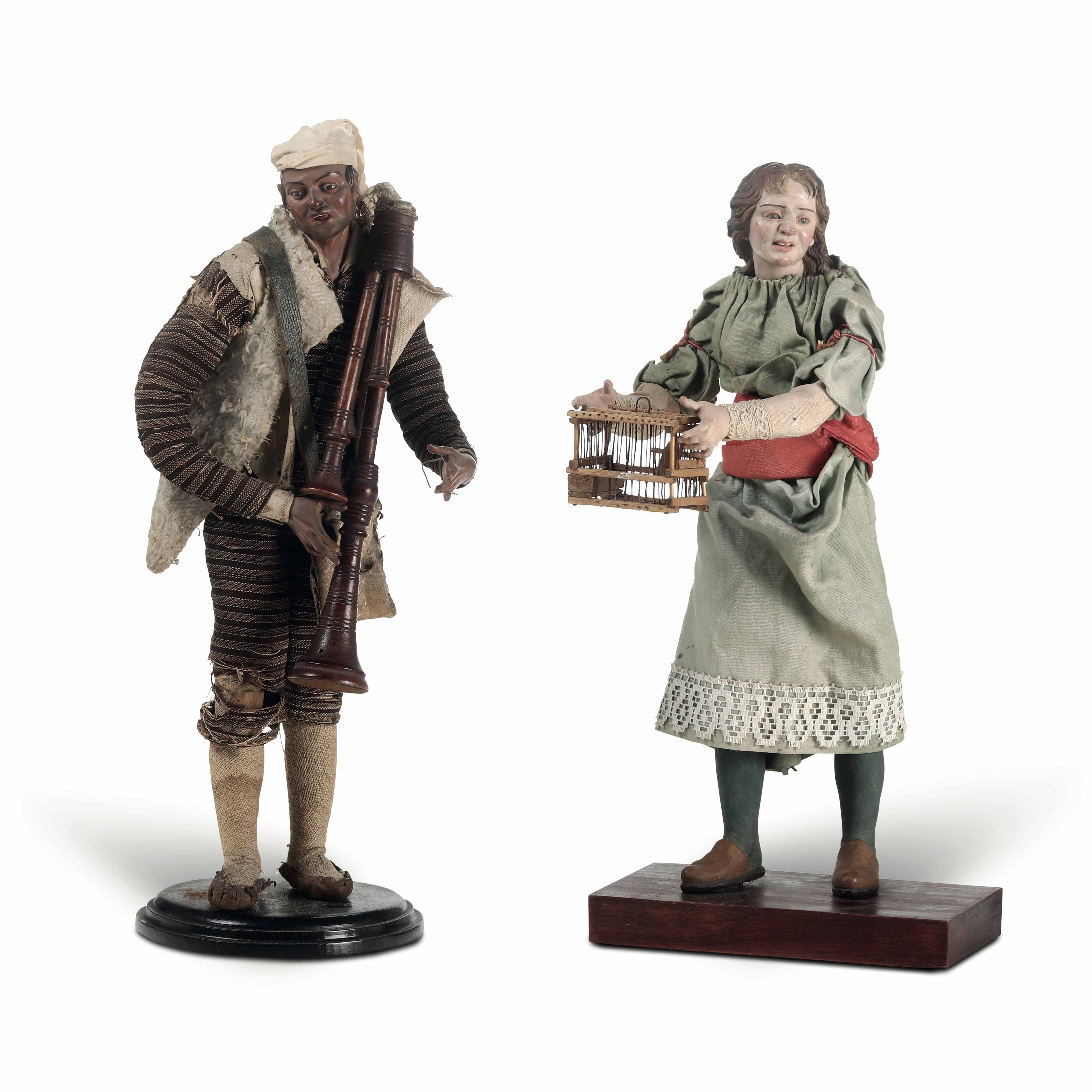Due figure da presepe. Zampognaro e venditrice con gabbia per volatili. Napoli, [..]