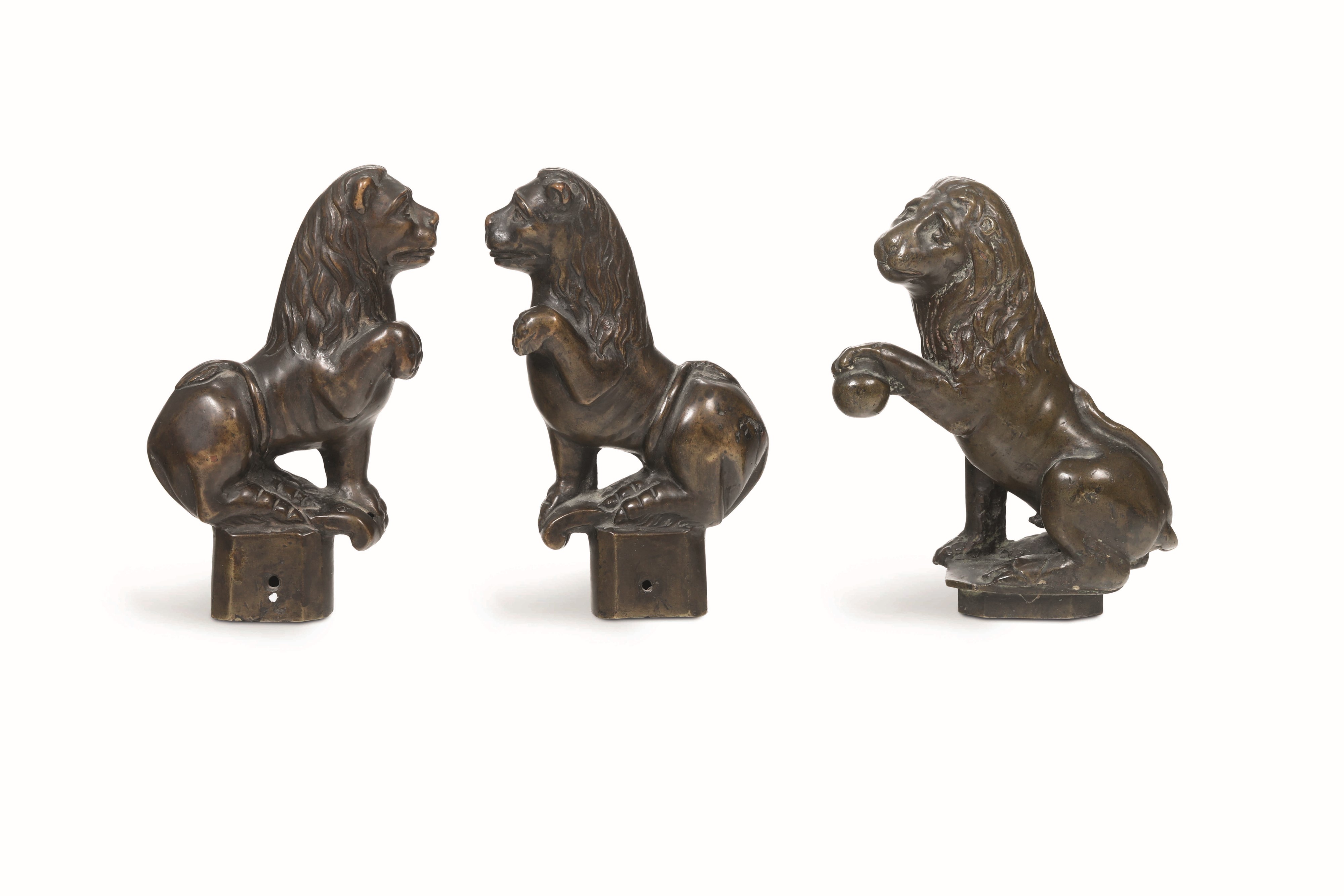 Gruppo di tre leoni rampanti in bronzo fuso e cesellato. Fonditore del XVIII-XIX [..]