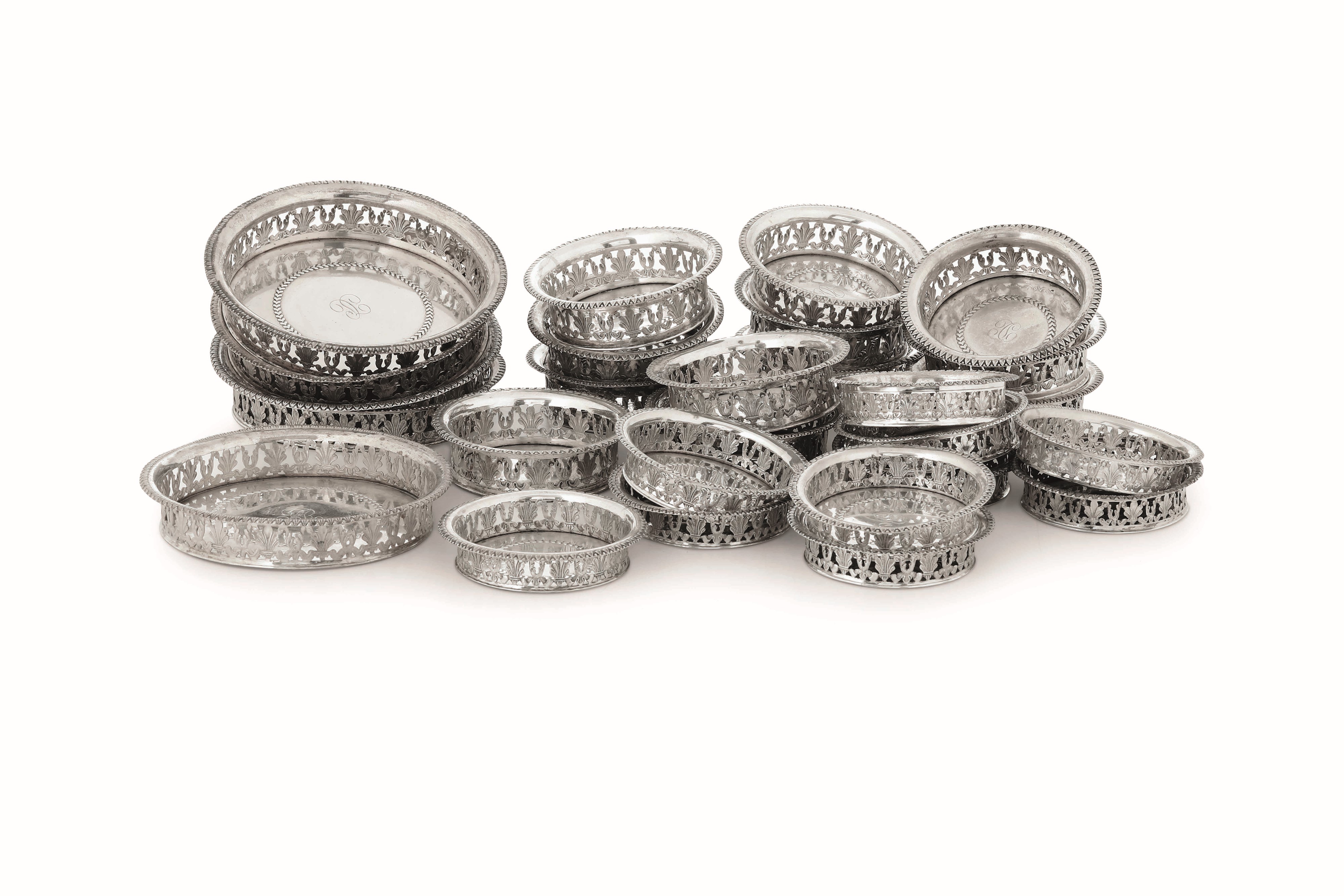 Insieme di cinque sottobottiglie e 12 + 10 sottobicchieri in argento sbalzato e [..]