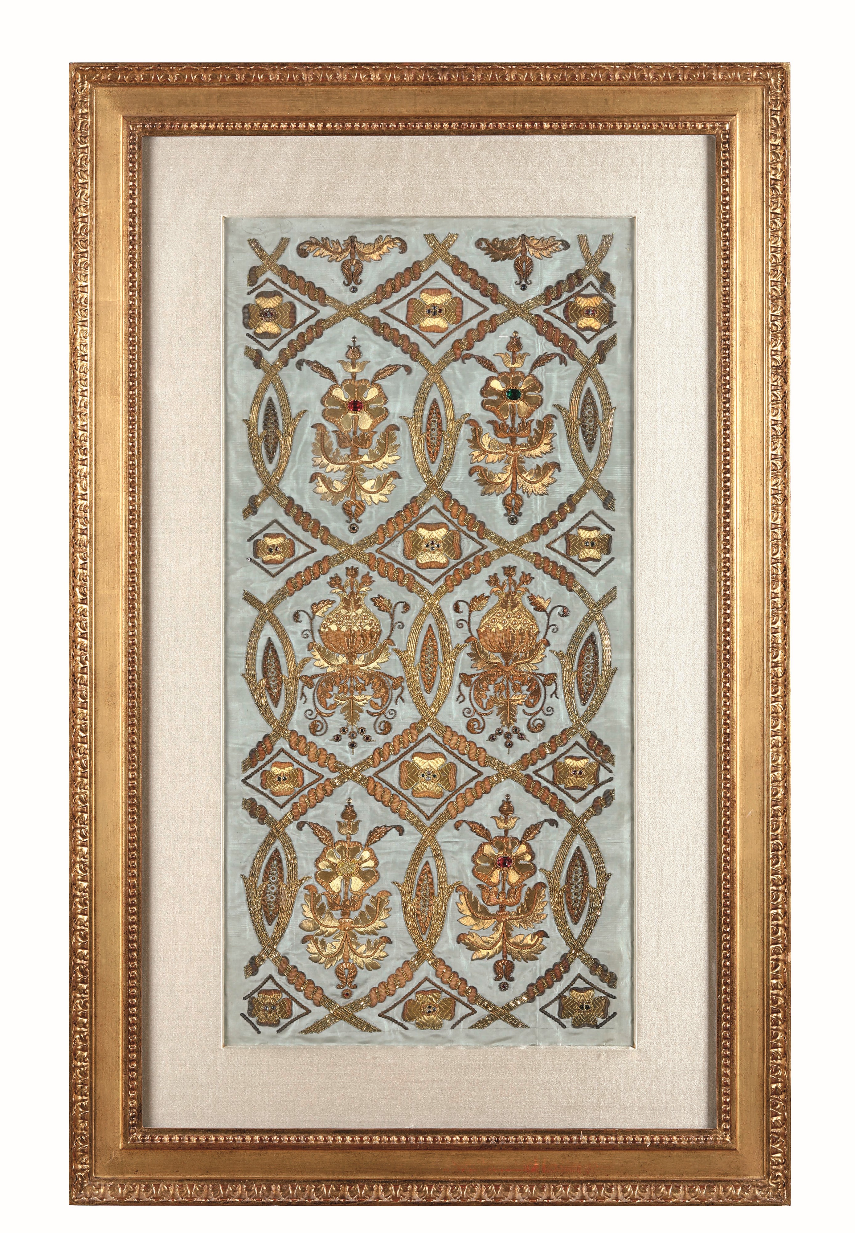 Lotto di due ricami con filo dorato e pietre dure (?)