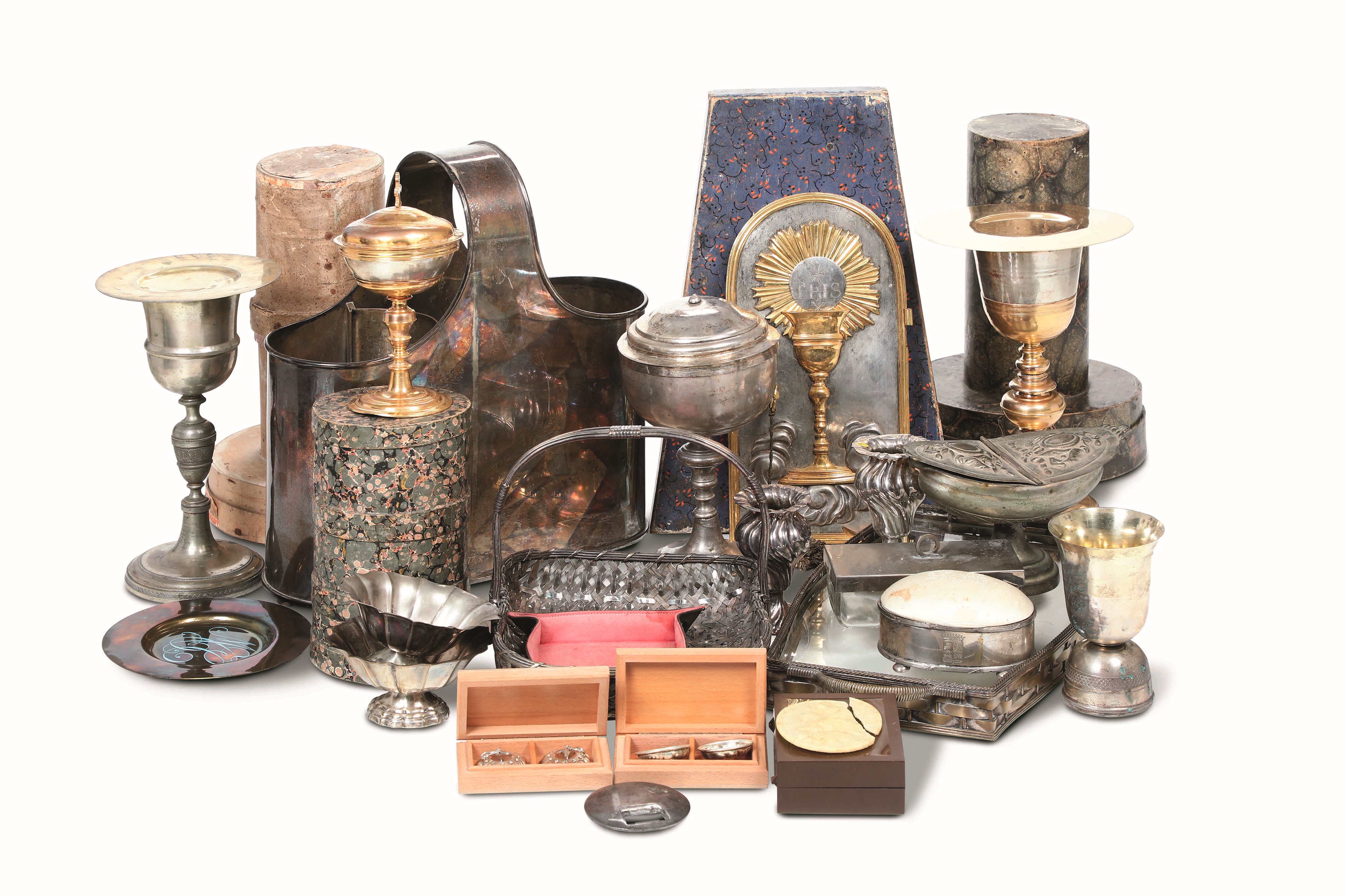 Lotto di oggetti in metallo argentato e altri materiali