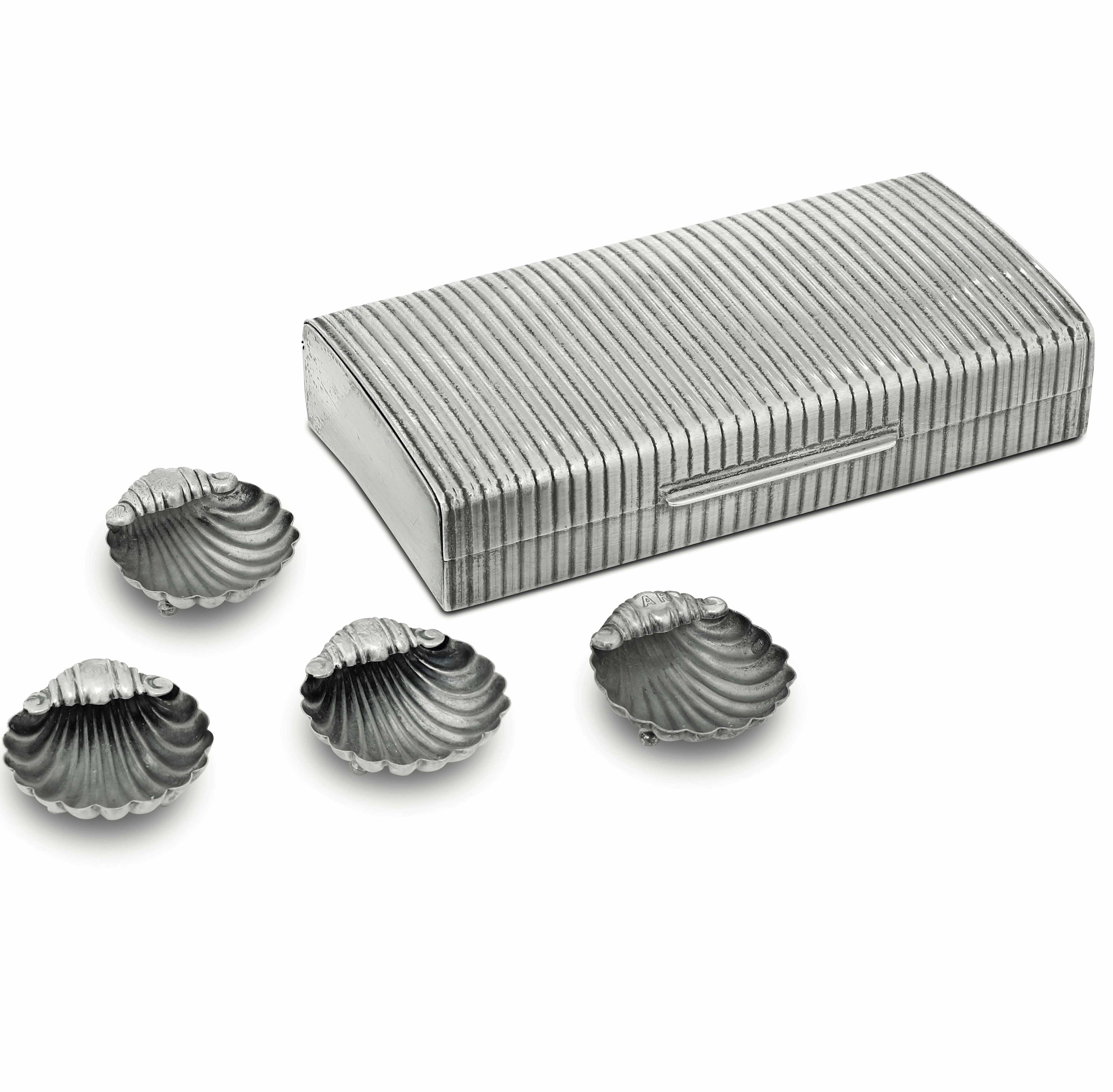 Lotto in argento composto da una scatola, un piatto e quattro salierine in forma [..]