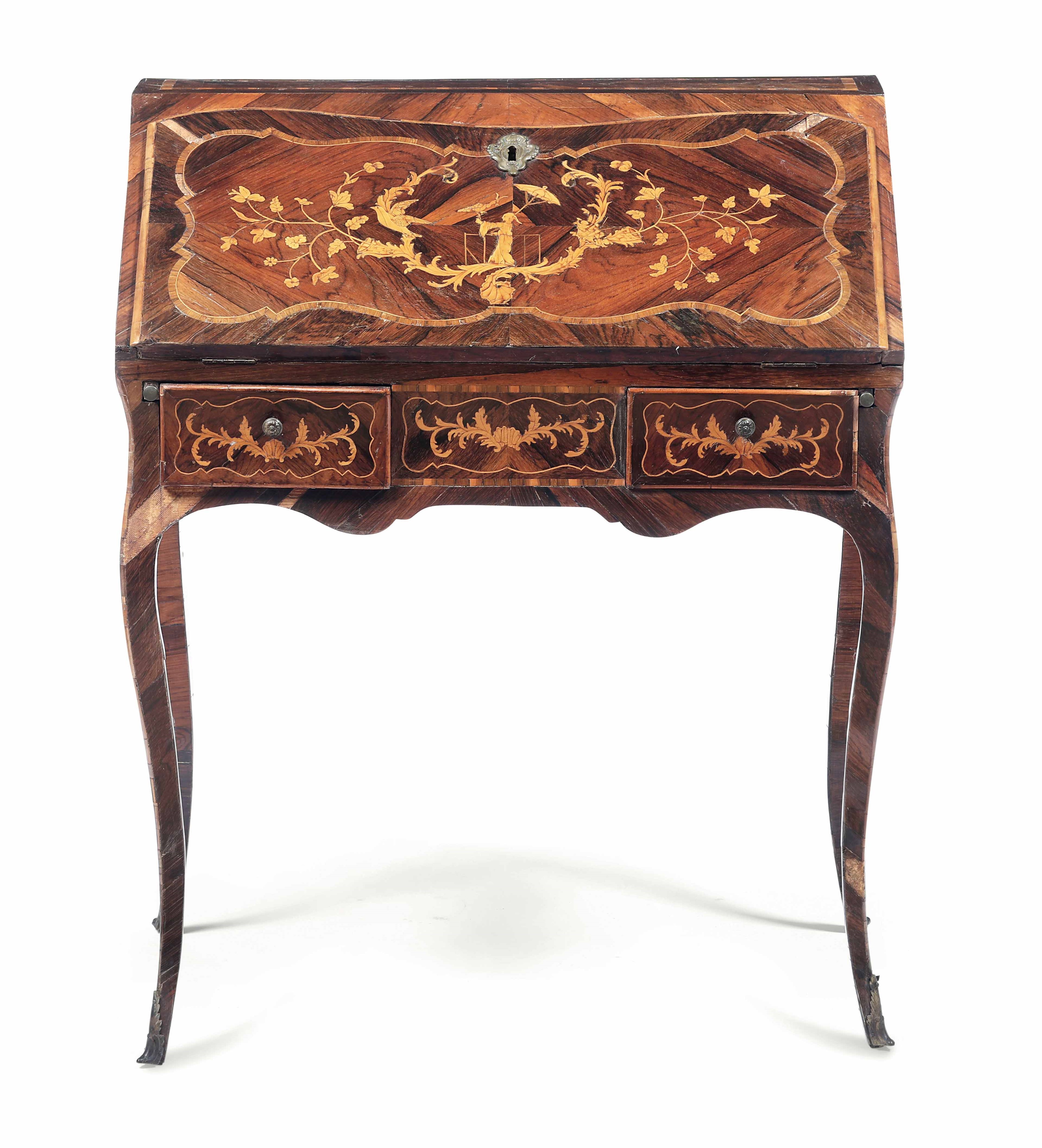 Piccolo bureau Luigi XV lastronato in palissandro e intarsiato in legno chiaro. [..]
