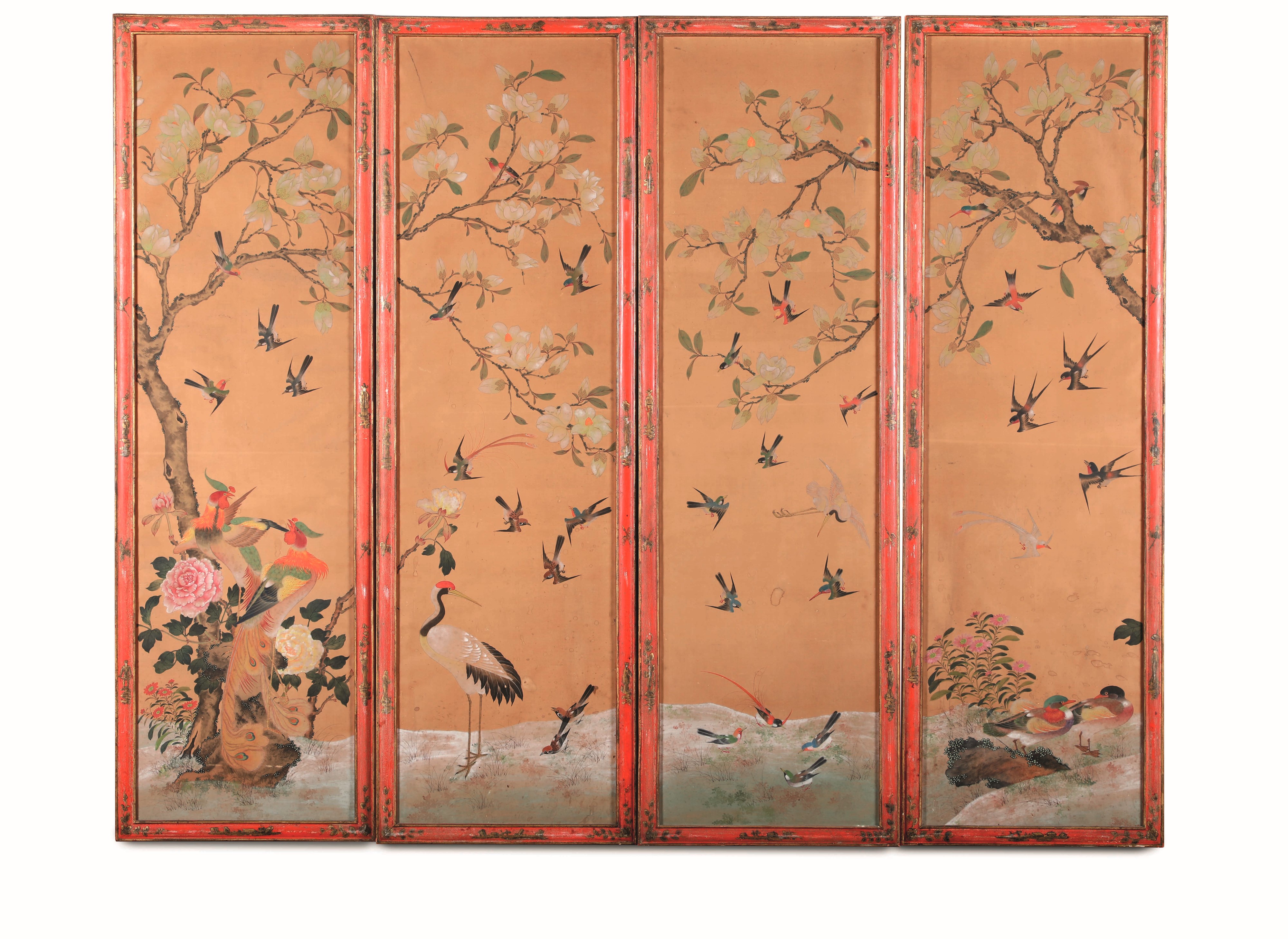 Quattro pannelli dipinti con motivi a chinoiserie. Piemonte XVIII secolo