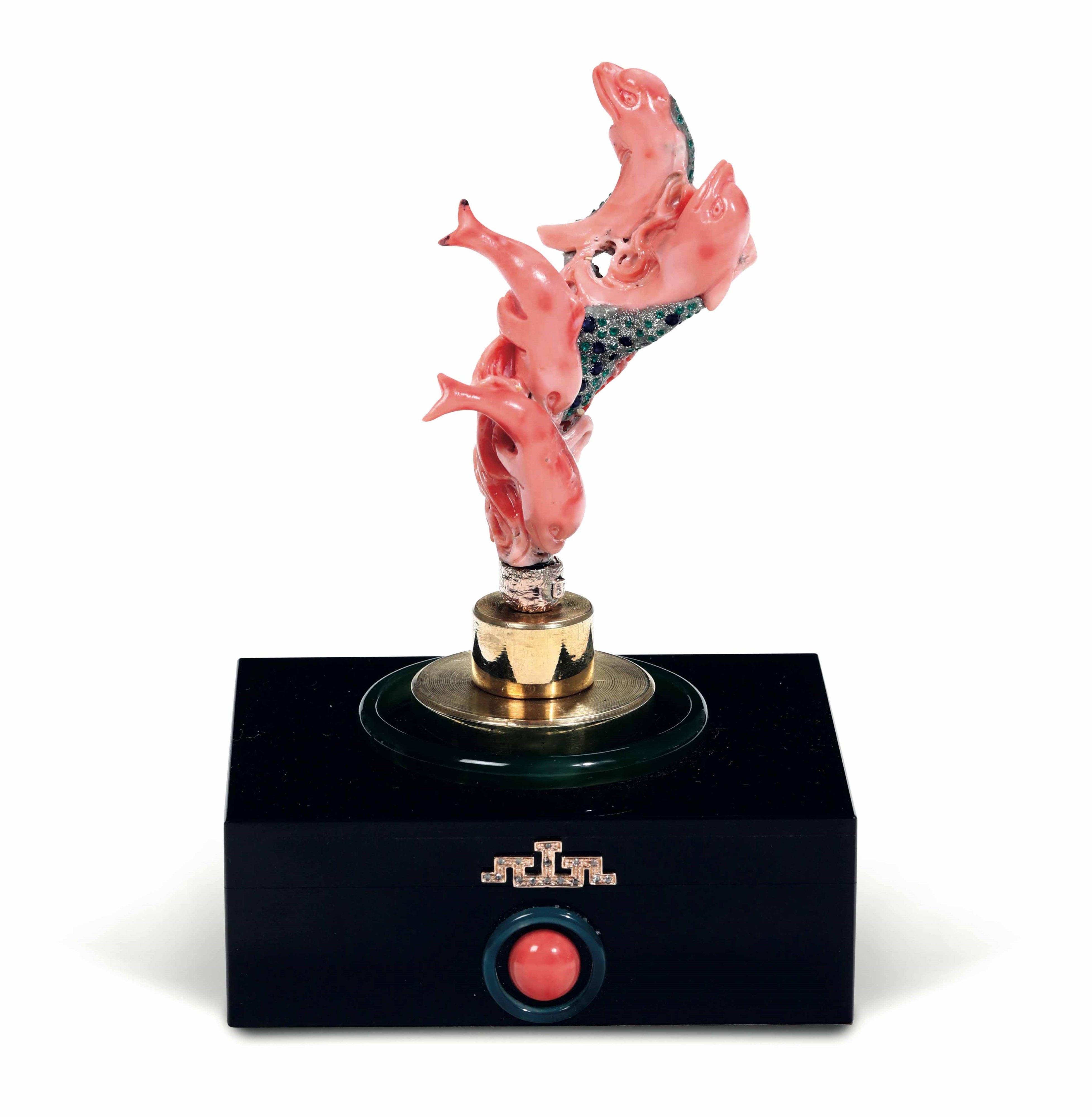 Scatola con sigillo. Onice, corallo, agata, zaffiri, rubini, diamanti e oro 9Kt. [..]