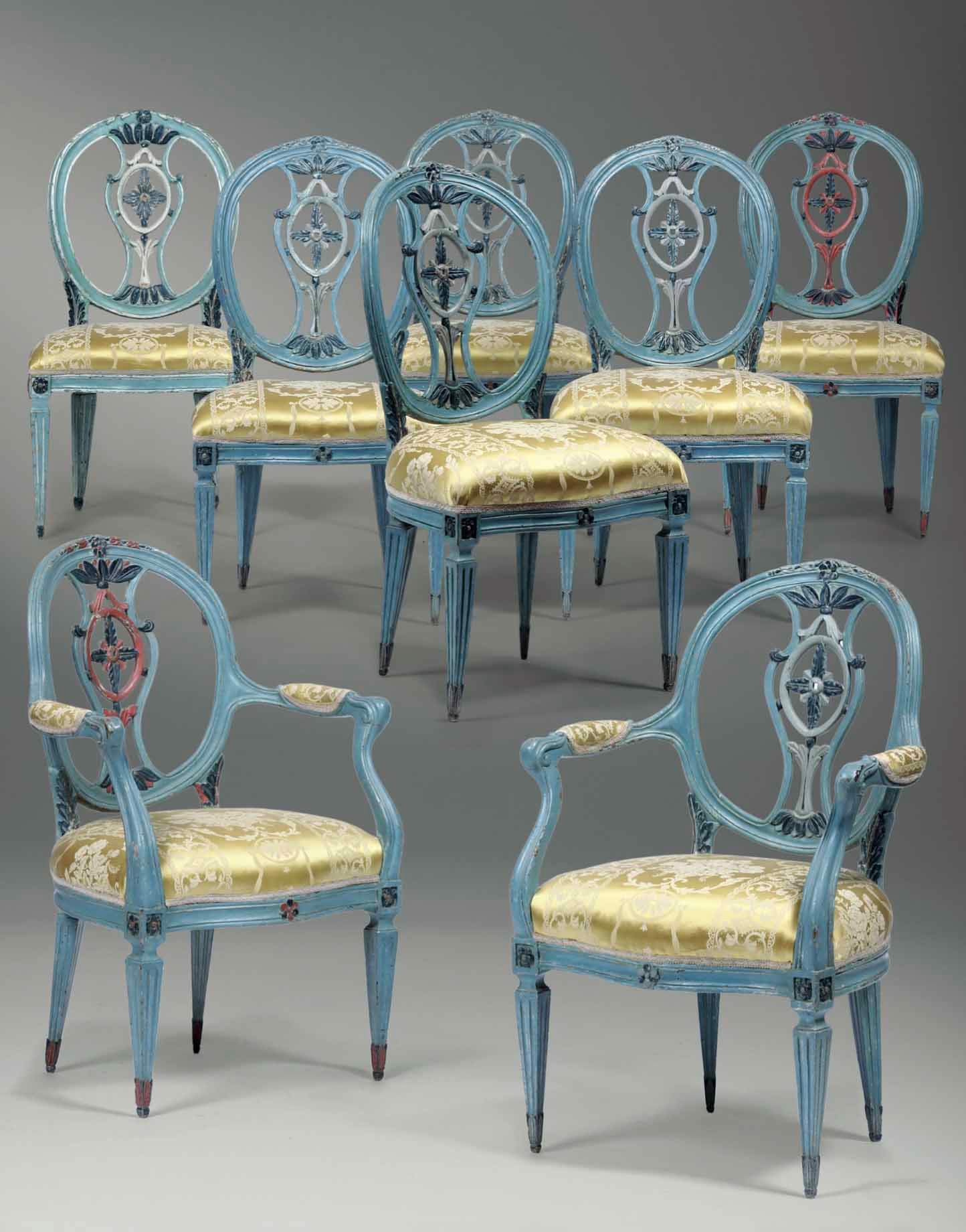 Set composto da sei sedie e due poltrone in legno laccato. Toscana XVIII secolo