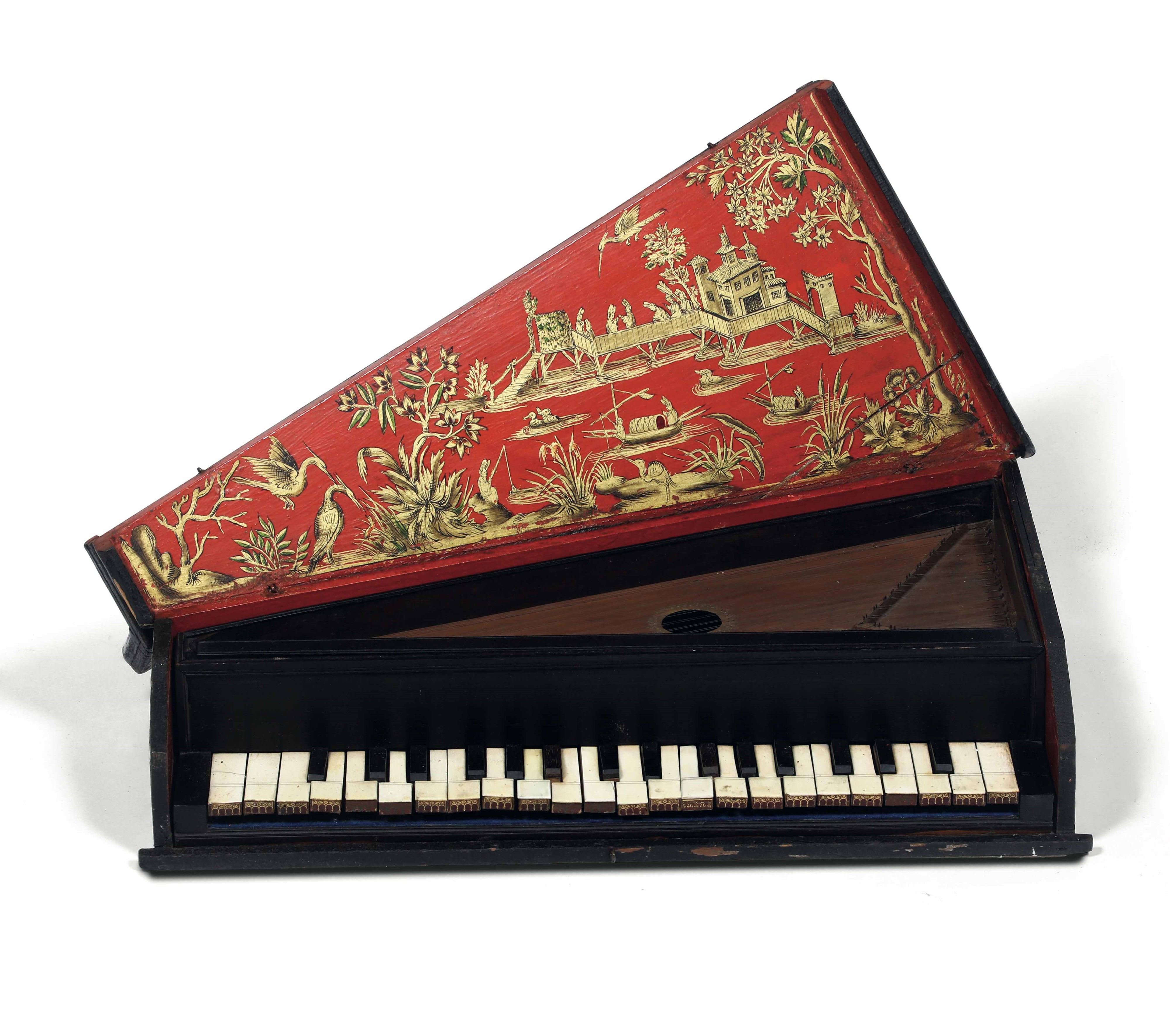 Spinetta portatile con cassa in lacca verde all'esterno e rossa e oro all'interno [..]