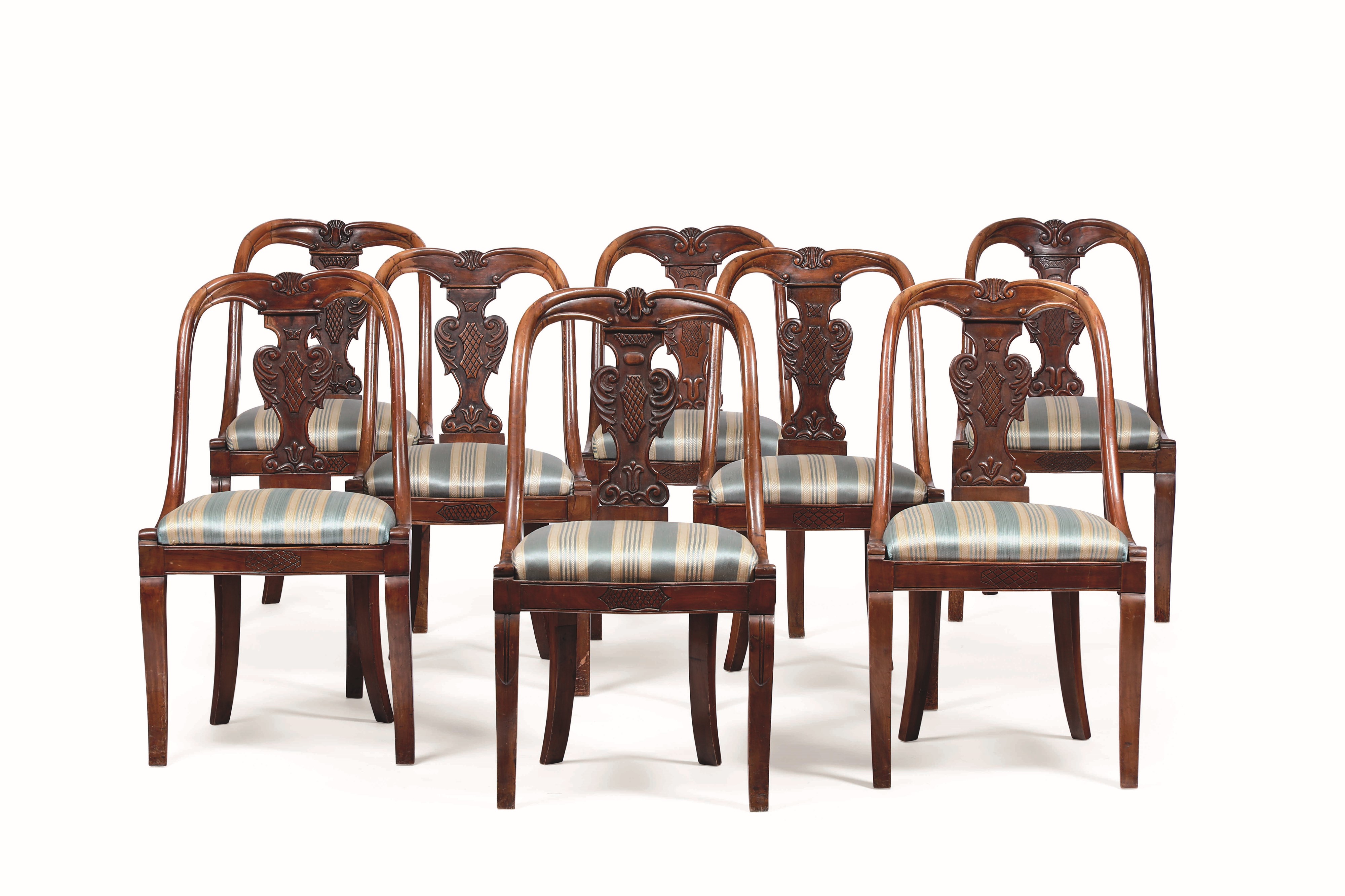 Tavolo allungabile lastronato in mogano e otto sedie con schienale a cartella intagliata. [..]