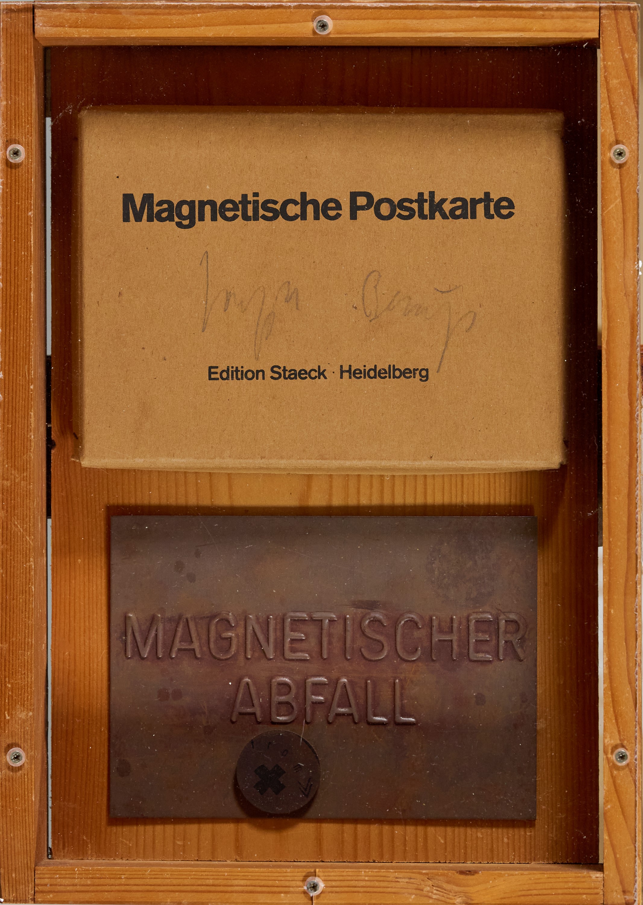 Multiplo in ferro, magnete e scatola di cartone stampata entro cassetta di legno e plexigas, cm. 31x22x7