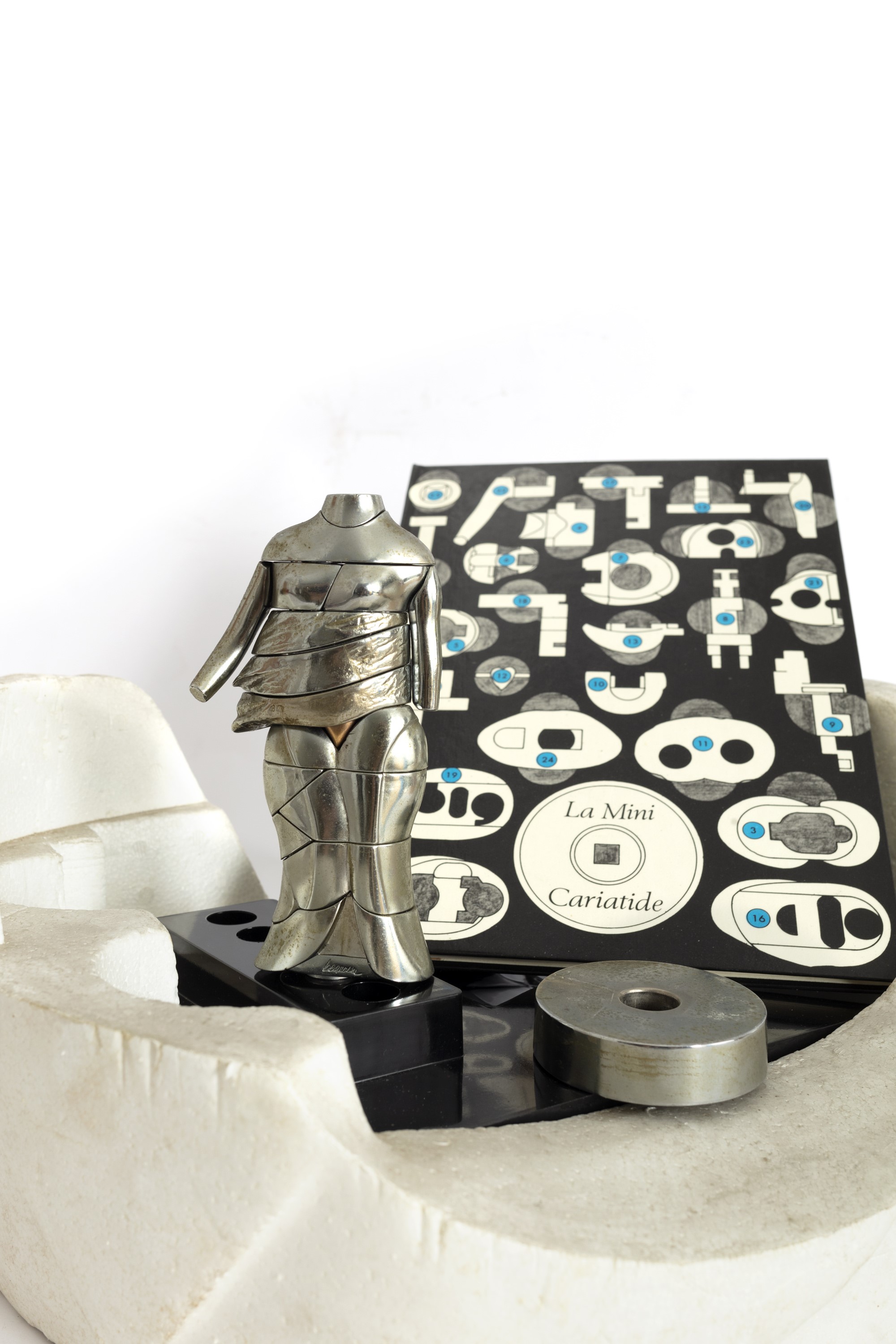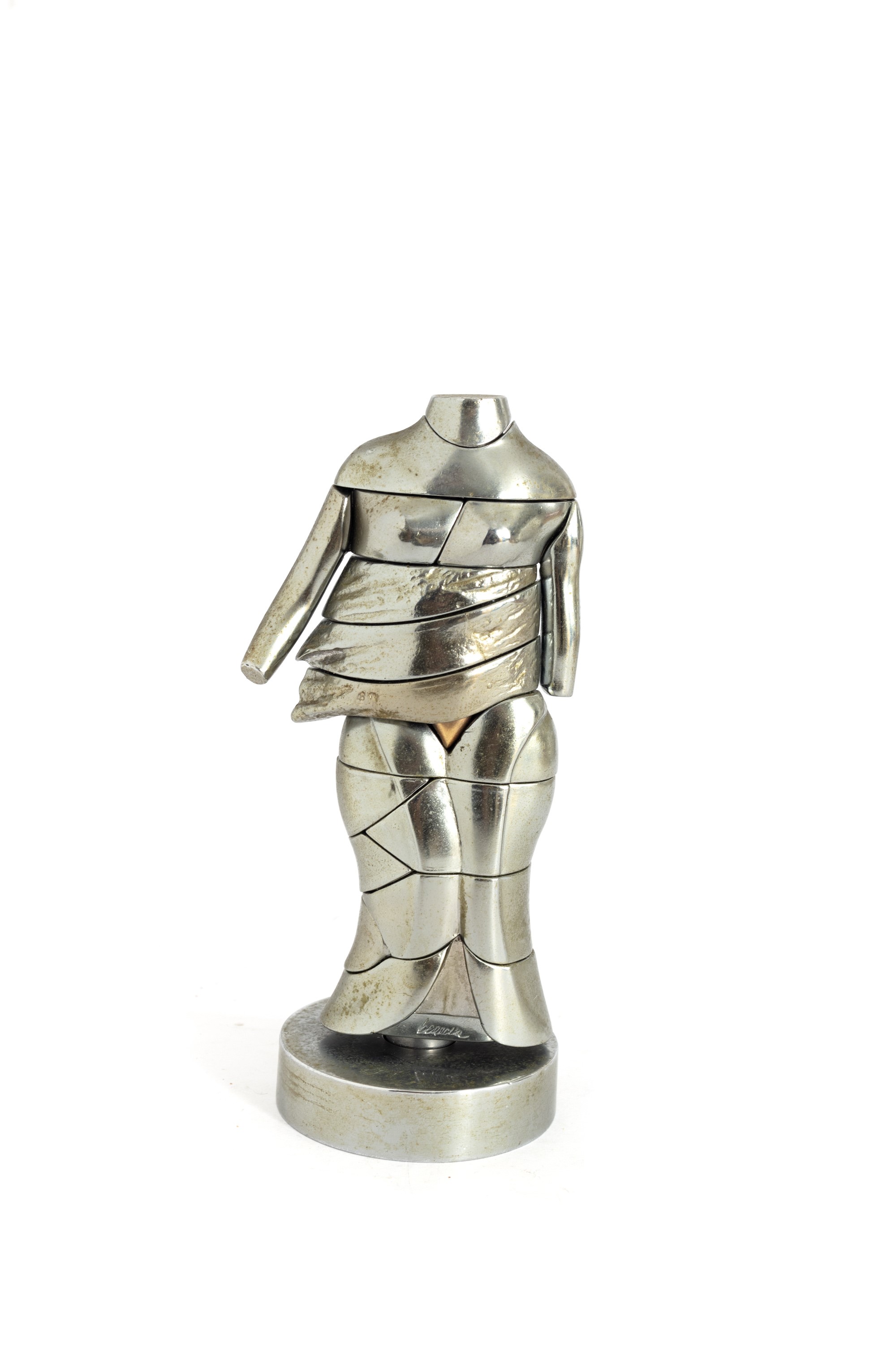 alpacca ed ottone, scultura smontabile composta da 24 elementi es. 1853 (dall'edizione di 6 ess. in 1968/'69 Firma incisa in basso al centro Entro custodia originale in polistirolo, all'interno della quale si trova la base in plexiglass ed il libro d'istruzioni per il montaggio