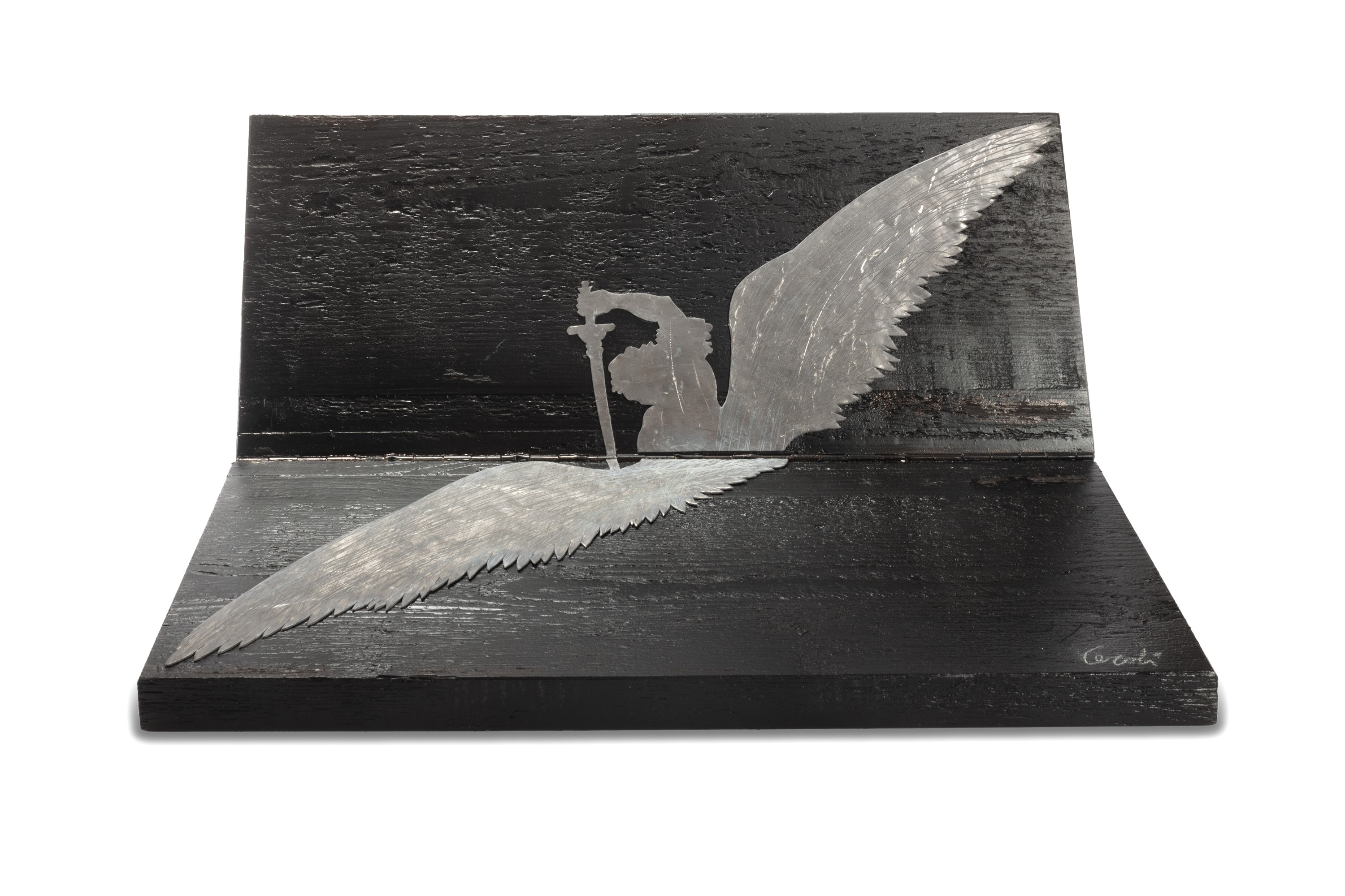 sagoma in piombo su legno di pino di Russia dipinto, es. VII/XX, cm 18 x 45 x 20 (misure aperto)