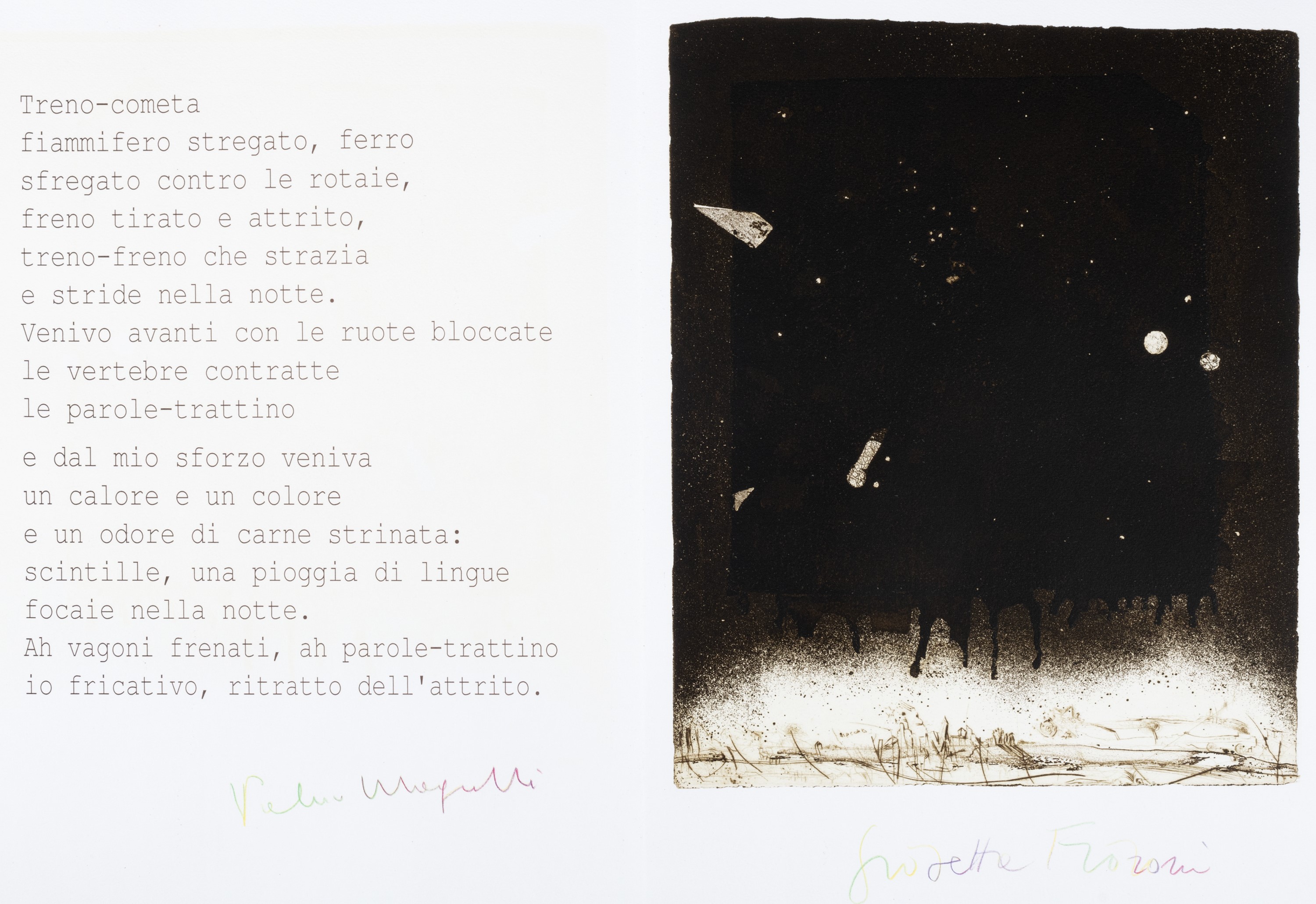 Sulla sinistra del foglio una poesia di Valerio Magrelli con firma autografa