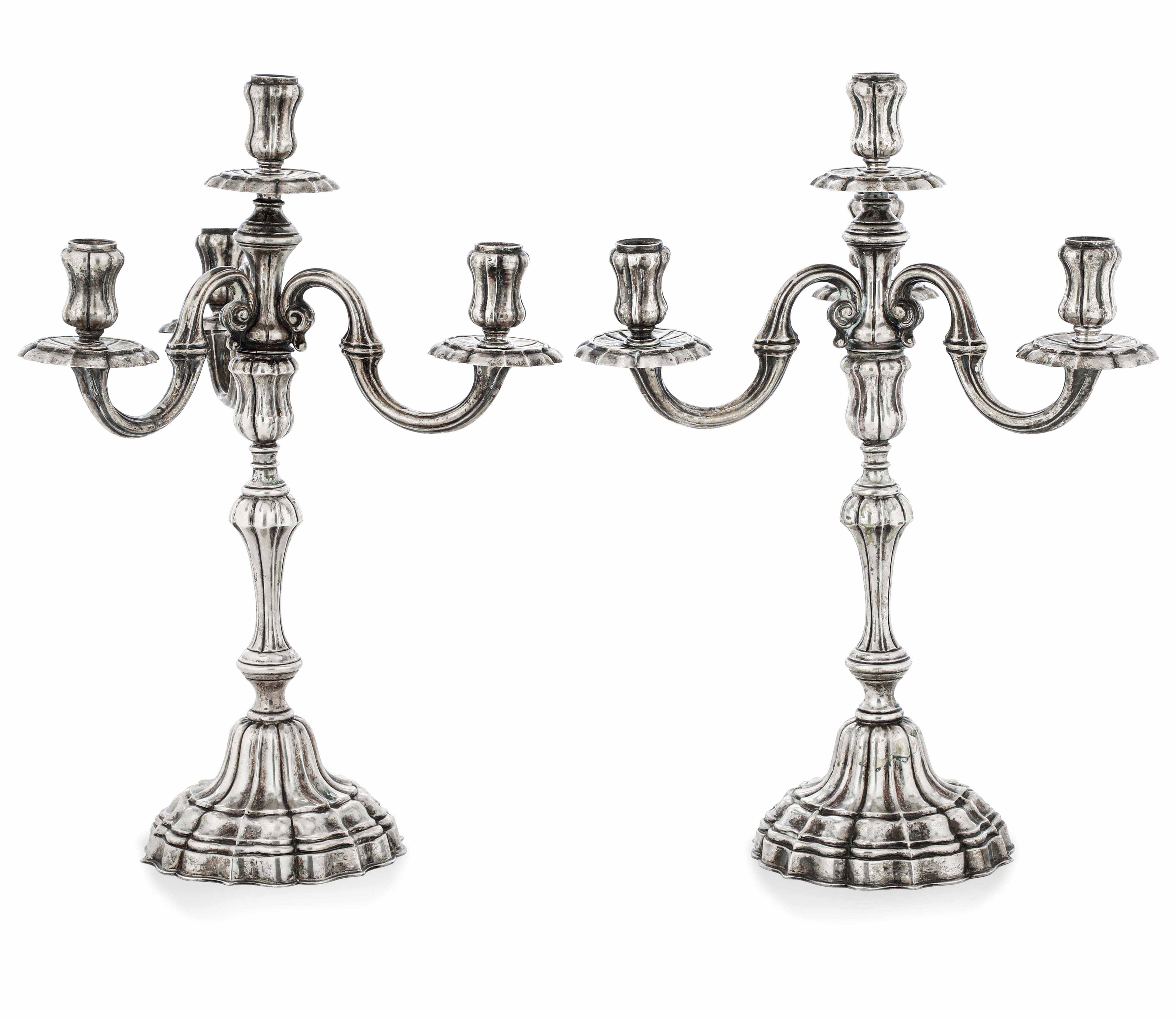 Coppia di candelabri a quattro fiamme. Argento fuso e sagomato. Argenteria milanese [..]