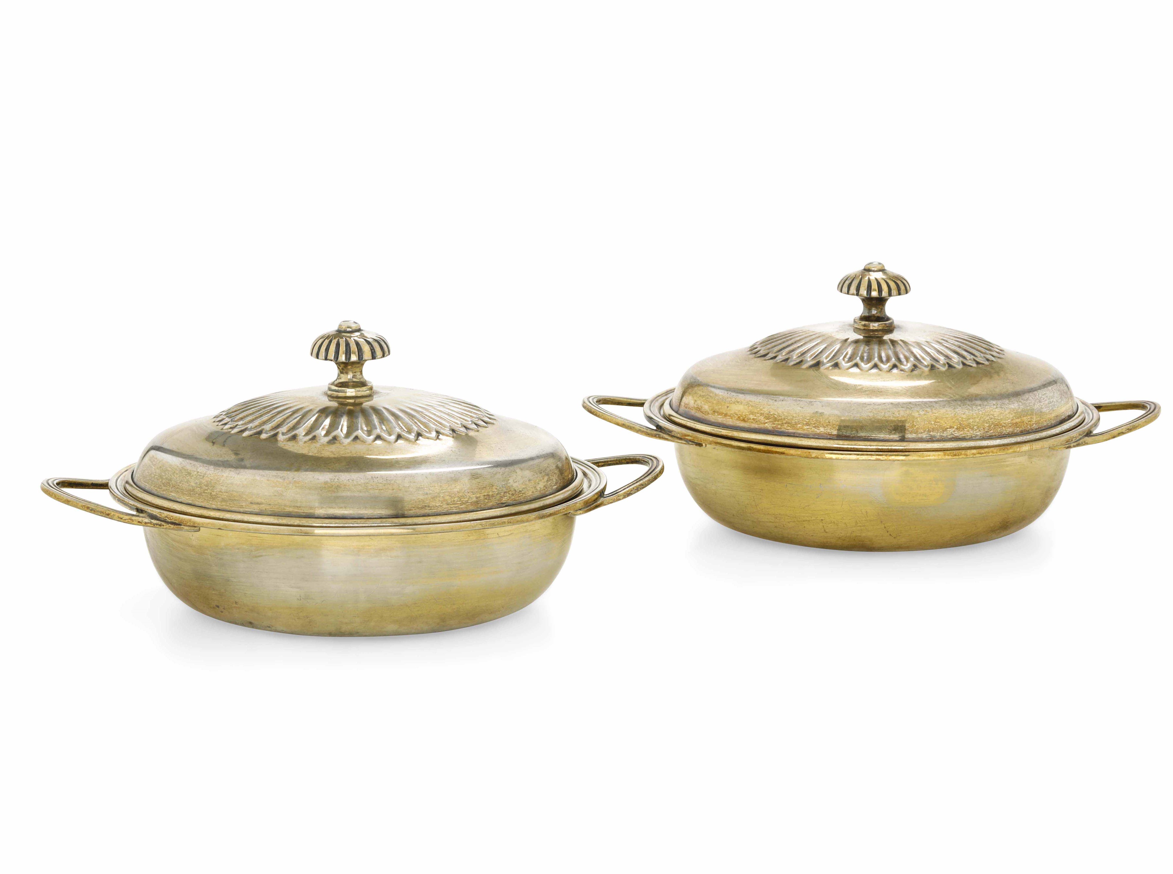 Coppia di legumiere. Argento fuso, sagomato e dorato. Argenteria artistica milanese [..]