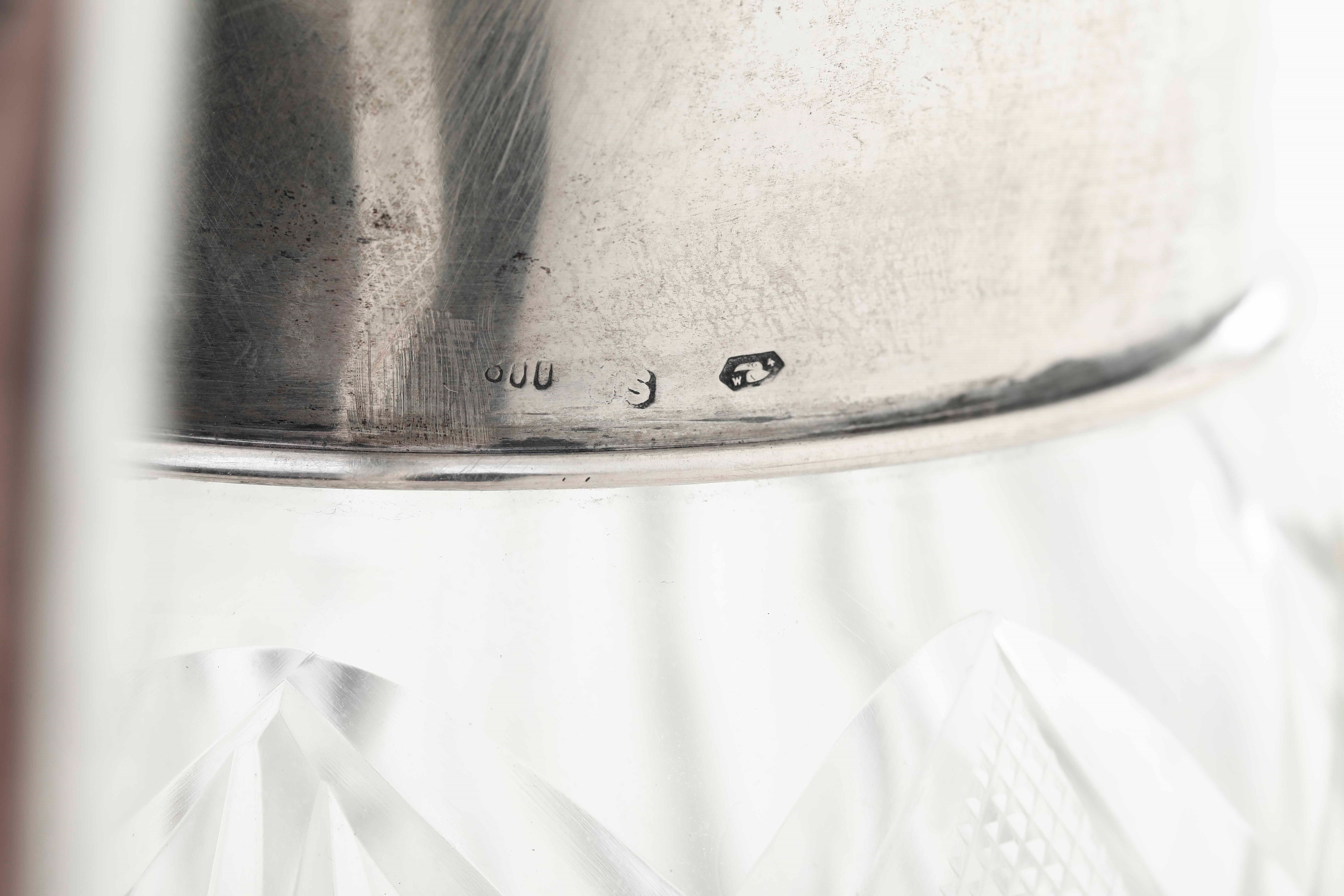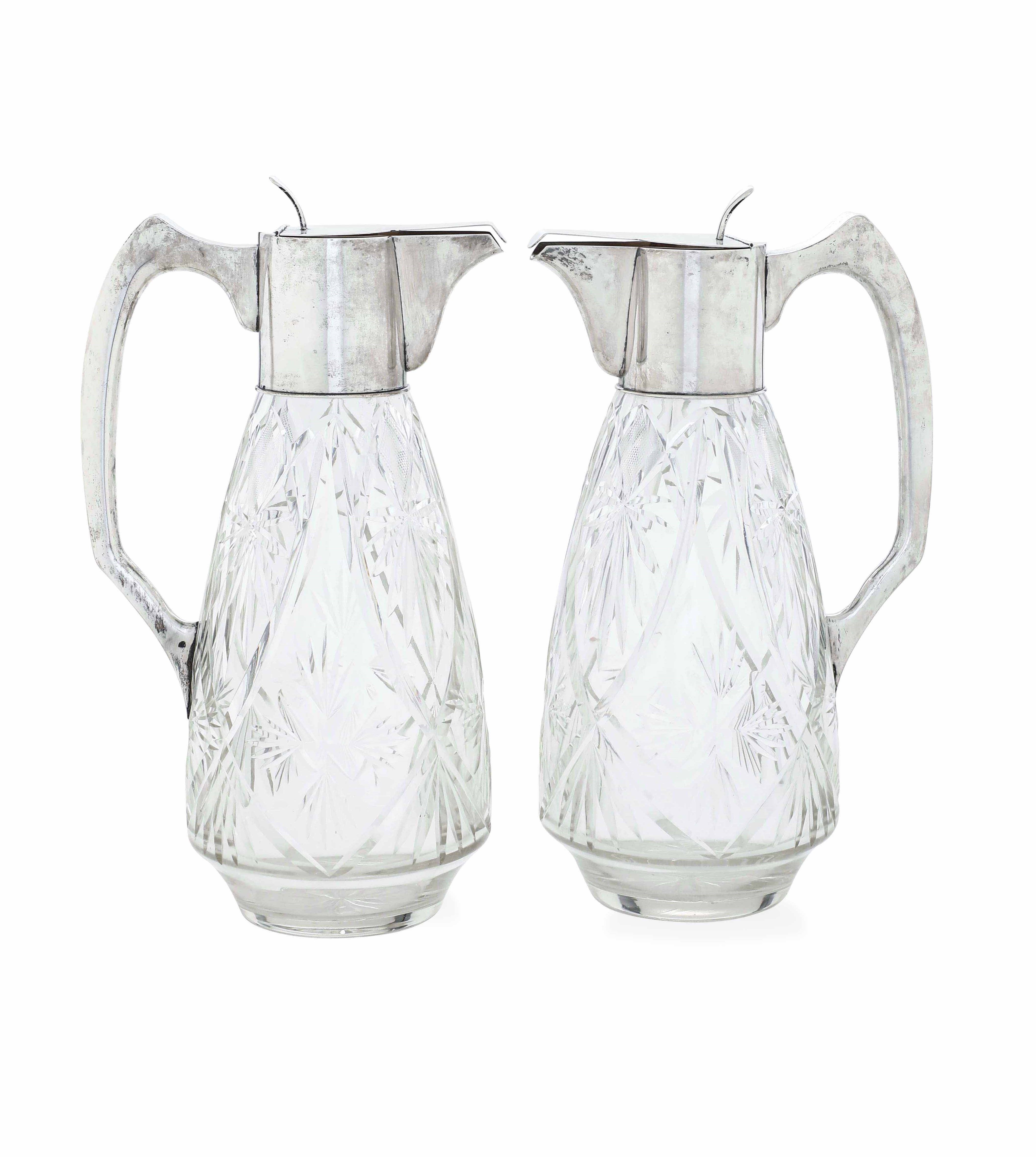 Coppia di versatoi in vetro molato con montatura in argento fuso e sagomato. Austria, [..]