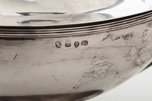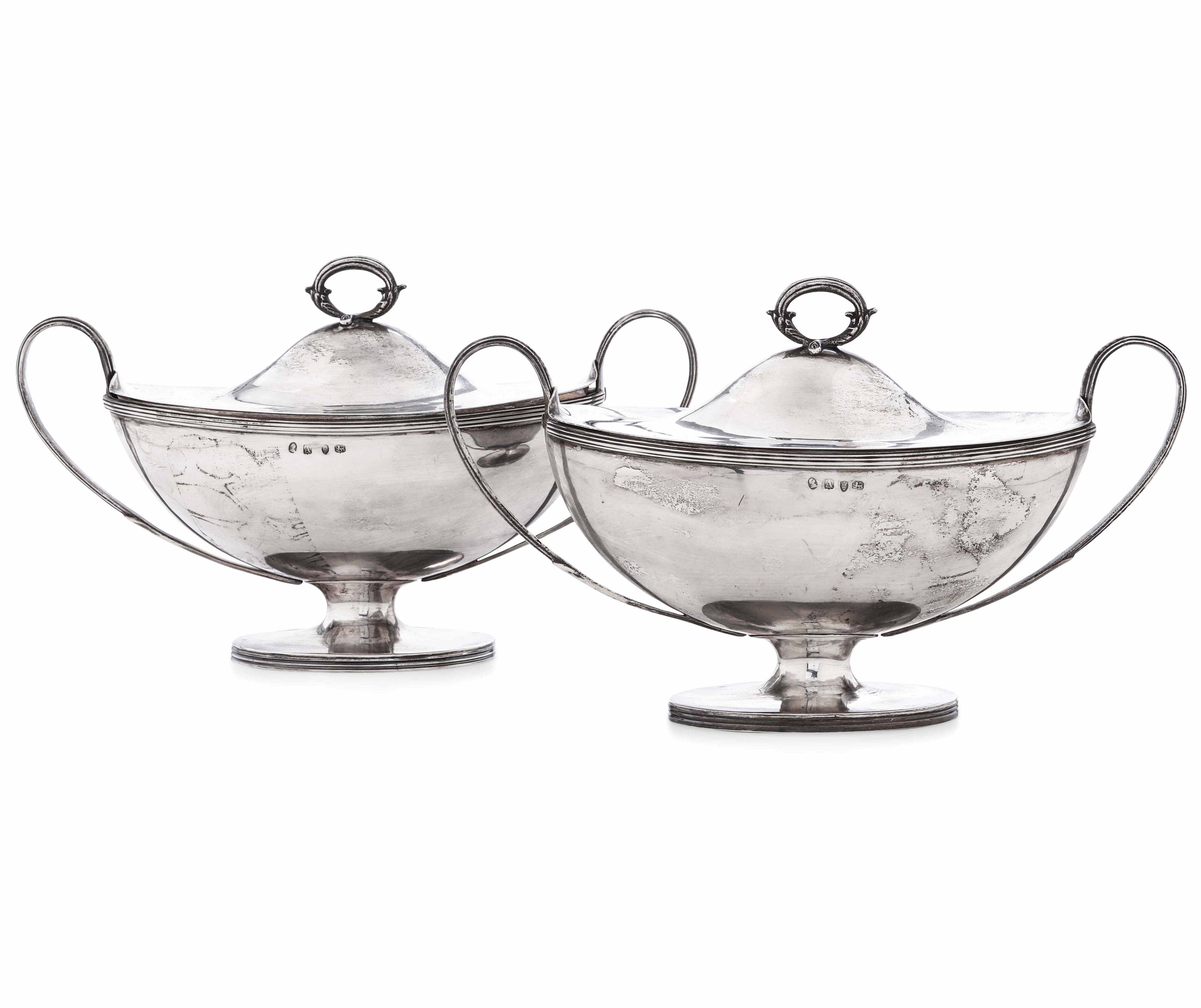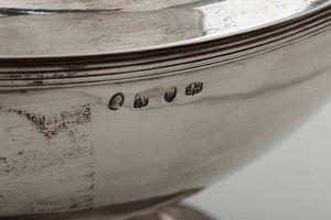 Coppia di zuppiere. Argento fuso, sbalzato e cesellato. Marchi della città di Londra [..]