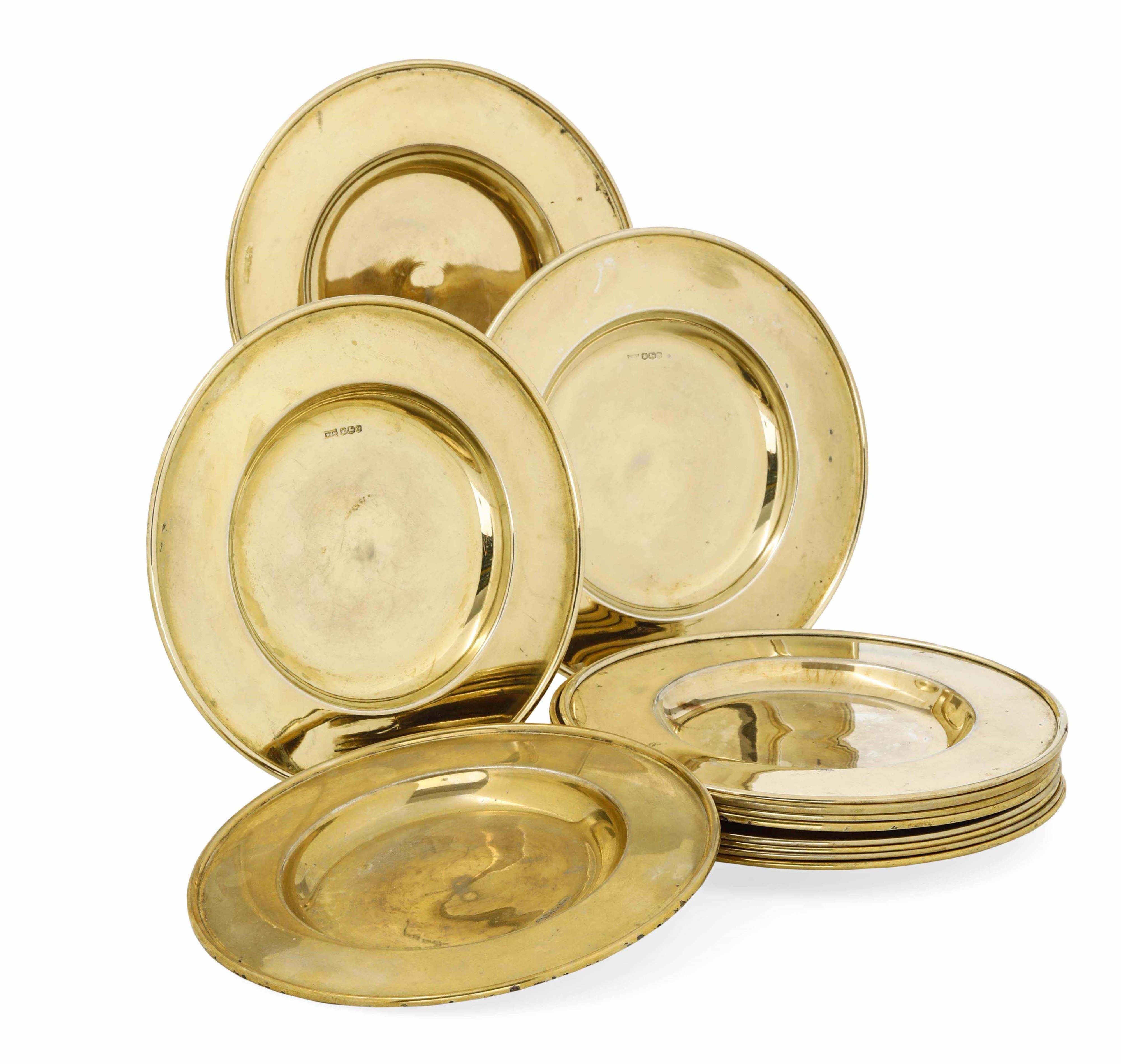 Dodici piatti argento vermeille fuso. Differenti manifatture inglesi del XX secolo, [..]