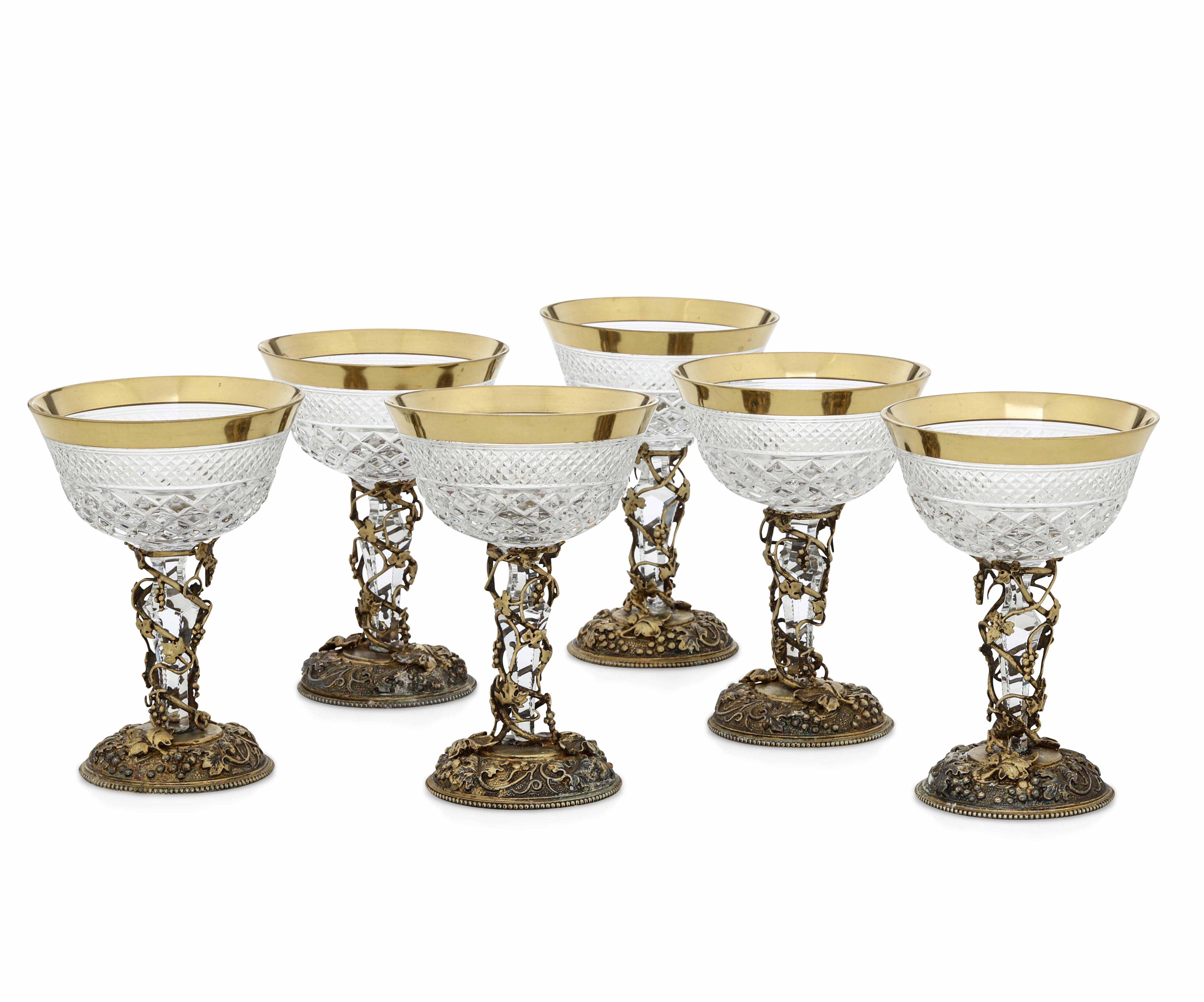 Sei coppe in cristallo con base in argento fuso, cesellato e dorato. Argenteria [..]