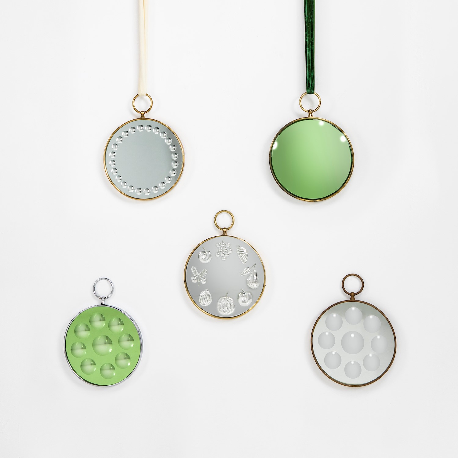 Strutture in ottone e ottone nichelato. Superfici riflettenti in vetro molato e vetro colorato molato. Tre specchi con nastri in tessuto e dettagli in ottone. Etichetta originale. Proveniente da una collezione privata - Capri. Prod. Fornasetti, Italia, 1960 ca. Tre specchi: cm 30x2x h 40; Specchio convesso - vetro verde: cm 30x4x h 40 (con nastro h 140); Specchio con bolle: cm 30x2 x h 40 (con nastro h 124)