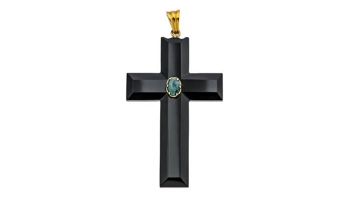 Cm 7x4 a forma di croce in onice con al centro opale cabochon. Gancio in oro giallo