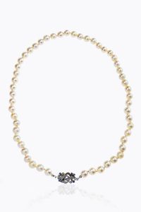 Lunghezza cm 48 composto da un filo di perle giapponesi (difetti) del diam di mm 7 7 a 8 ca. Chiusura in oro bianco [..]