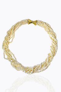 Lunghezza cm 50 composta da otto fili di perle di acqua dolce. Chiusura in oro giallo a fiocco
