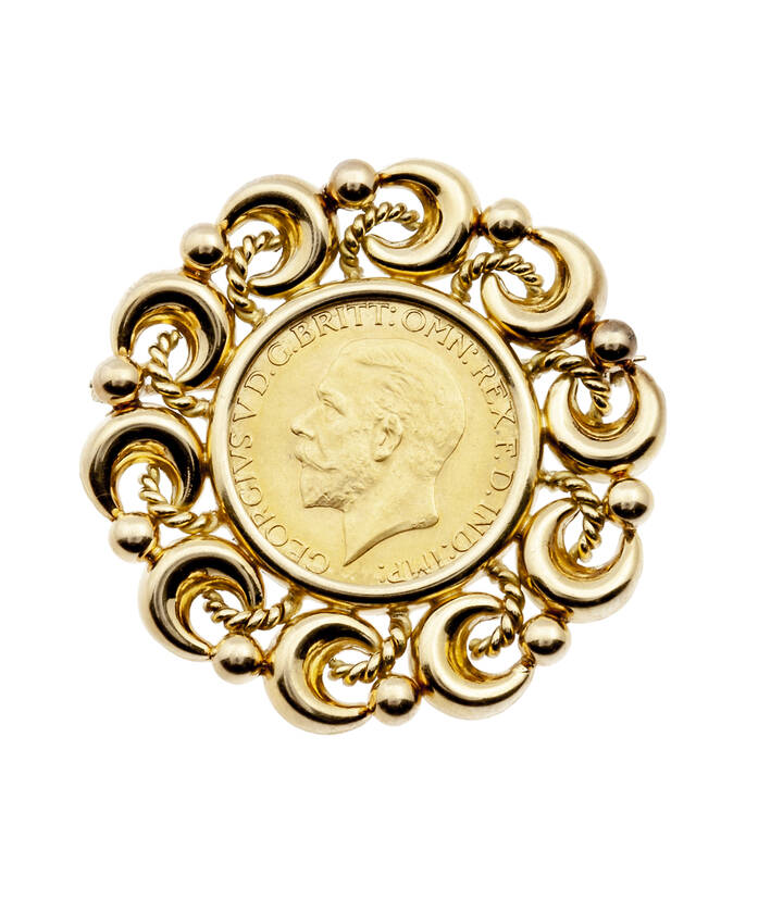 in oro giallo con al centro una Sterlina circondata da bordo a mezzelune. Peso gr 15 8