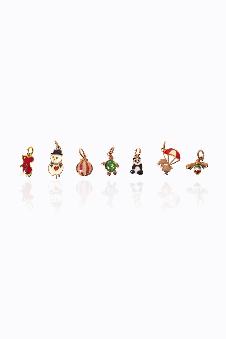 Lotto di sette charms Pomellato linea Dodo in oro 9 Kt con smalti policromi raffiguranti: un topolino un'ape una tartaruga un panda un dodo con paracadute una palla di Natale un pupazzo di neve