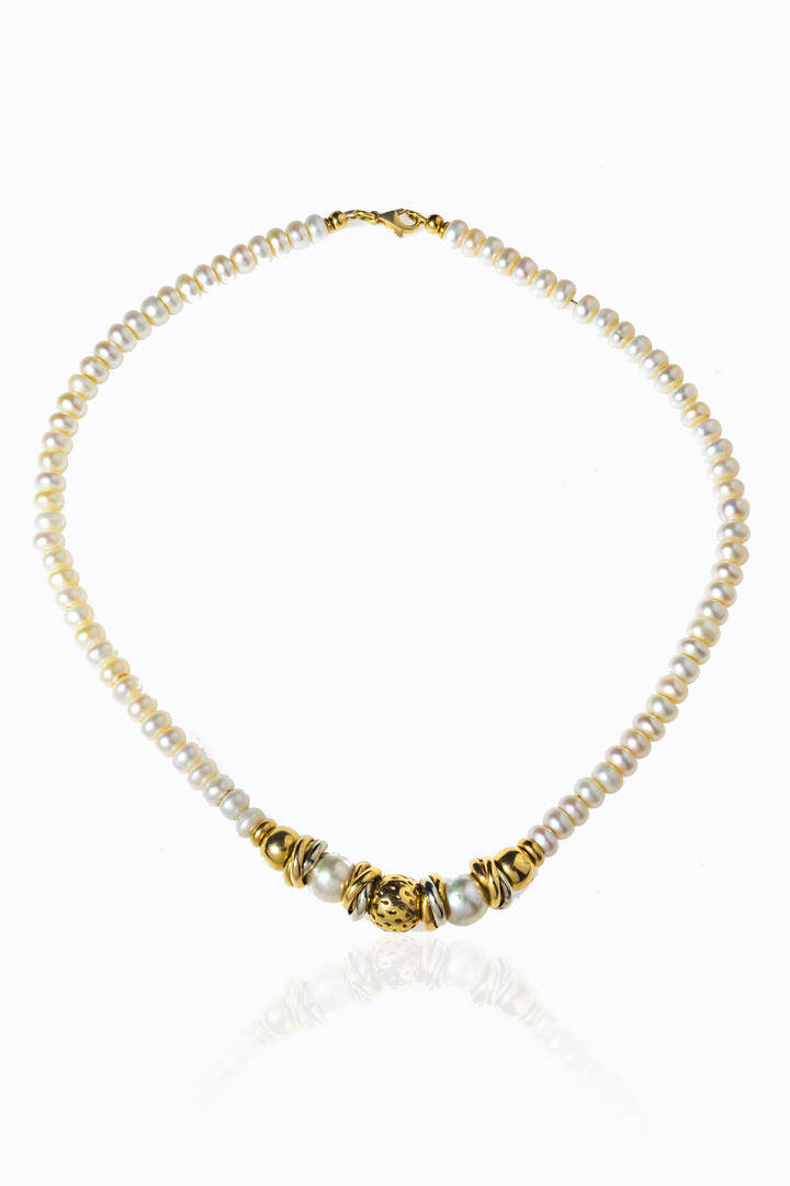 Lunghezza cm 40 composto da un filo di perle cipolline al centro due perle giapponesi alternate da sfere e distanziali in oro giallo e bianco