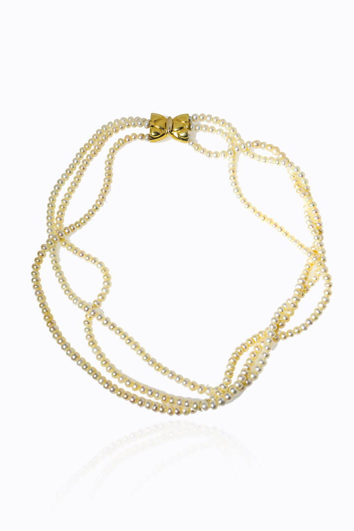 Lunghezza cm 44 composta da tre fili di perle cipolline. Chiusura in oro giallo a fiocco