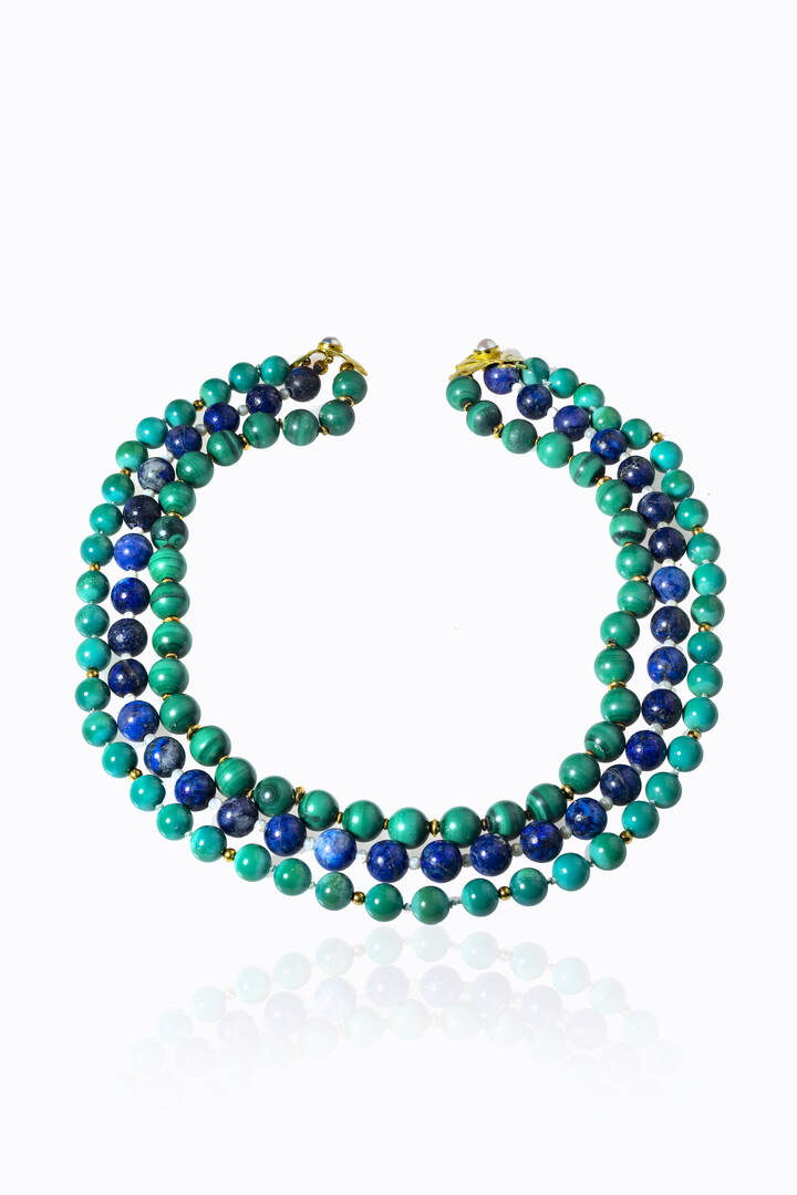 Lunghezza cm 45 ca composta da due file di sfere di malachite e di lapislazzuli del diam. di mm 10. Chiusura in oro giallo.