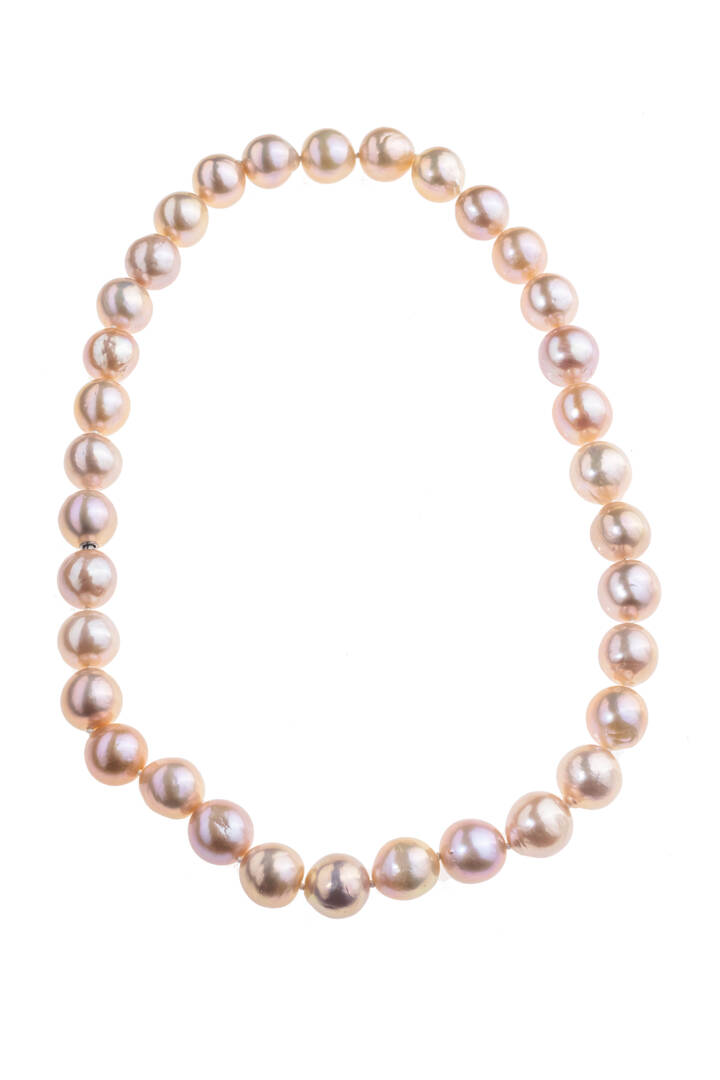 Lunghezza cm 45 composto da un filo di perle di acqua dolce scaramazze nei toni del rosa dal diam di mm 12 ca. Chiusura a scomparsa