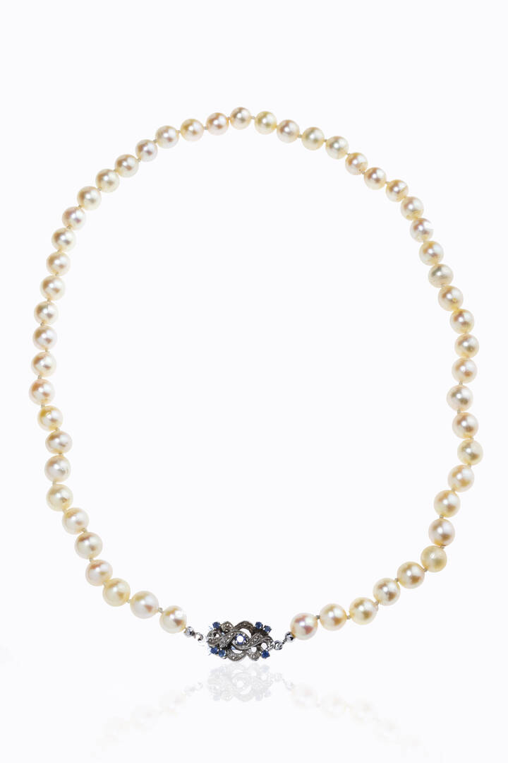 Lunghezza cm 48 composto da un filo di perle giapponesi (difetti) del diam di mm 7 7 a 8 ca. Chiusura in oro bianco con zaffiri