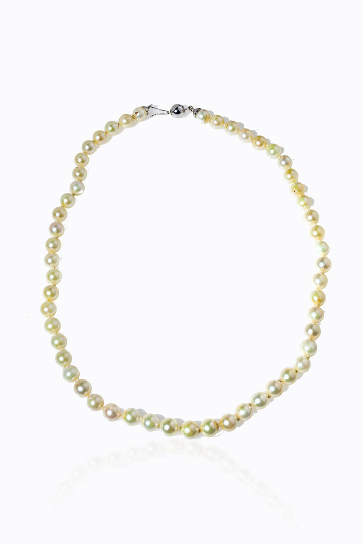 Lunghezza cm 50 composto da un filo di perle giapponesi del diam. di mm 8 e 8 5. Chiusura in oro bianco a sfera
