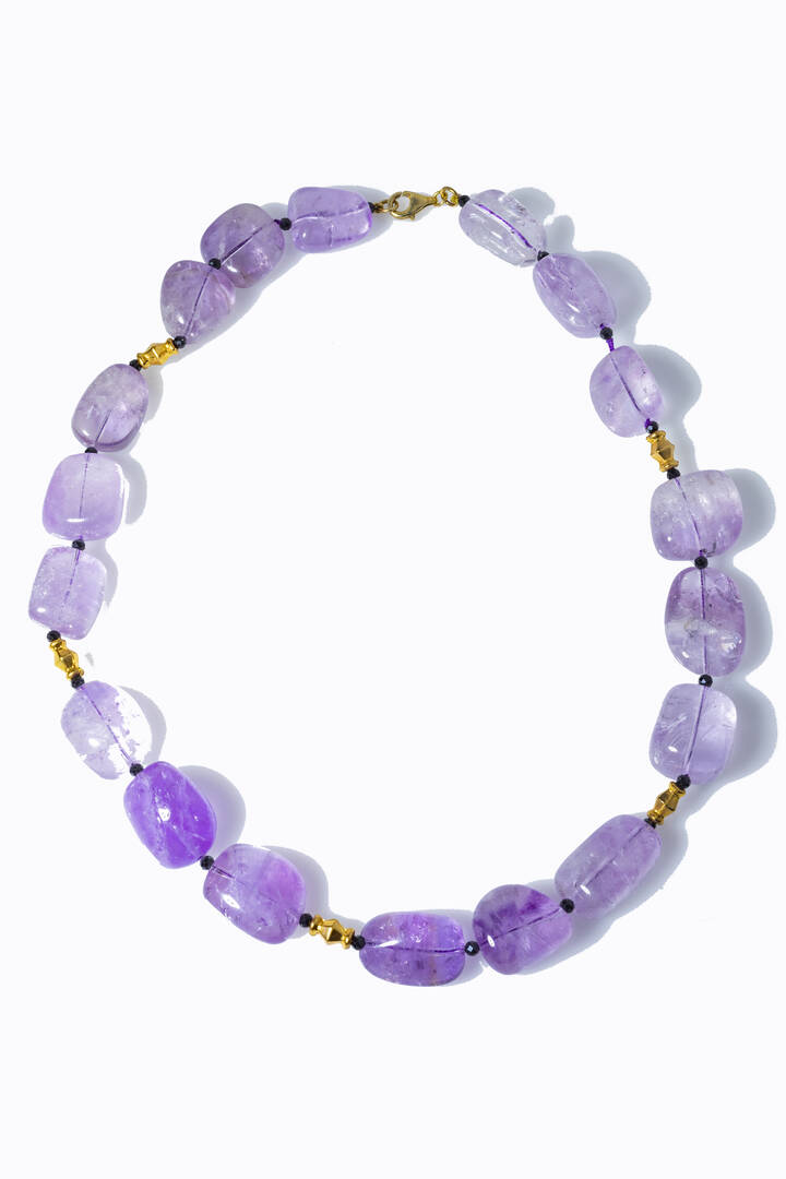 Lunghezza cm 52 composto da pepite di ametiste alternate a sfere di onice. Chiusura e distanziali in argento dorato