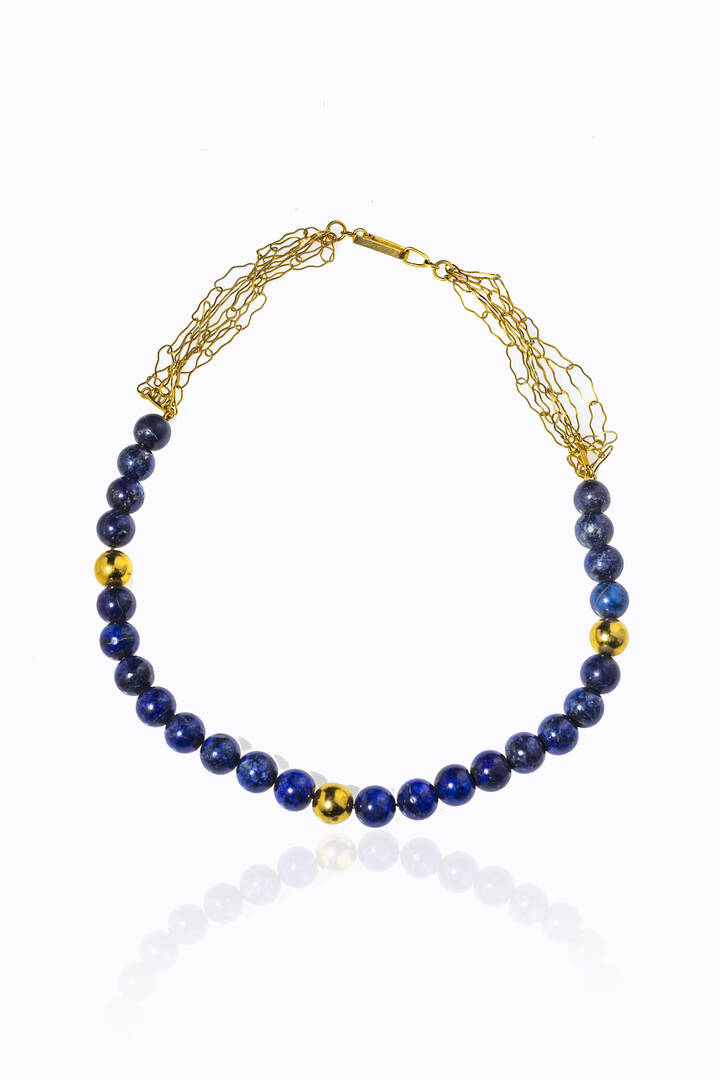 Lunghezza cm Girocollo composto da un filo di lapislazzuli punzonata Repossi (239 TO) con sfere di lapislazzuli del diam. di mm10 alternate a sfere in oro giallo e parte in anelli sagomati in oro