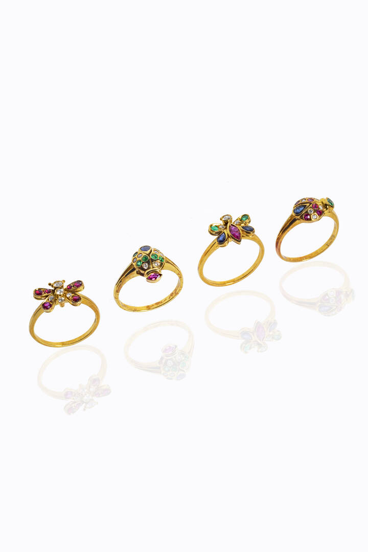 Peso complessivo gr 12 Misura 13 (53 9 e 12 (52) in oro giallo: due a forma di coccinella e due a forma di farfalla. Diamanti taglio 8/8 per totali ct 0 20 ca; zaffiri smeraldi e rubini per totali ct 1 0 ca
