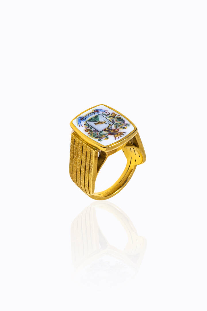 Peso gr 11 2 Misura 8 (48) Chevalier in oro giallo attribuibile alla maison Repossi; gambo satinato; sommità recante stemma nobiliare in smalto