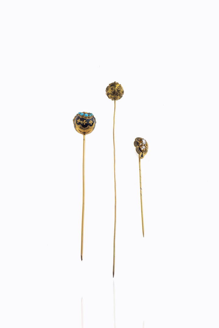 Peso gr 11 5 in oro giallo: il primo con sfera lavorata a filigrana il secondo con smalto nero e semisfere di turchesi; il terzo con due rosette di diamanti per totali ct 0 25 ca