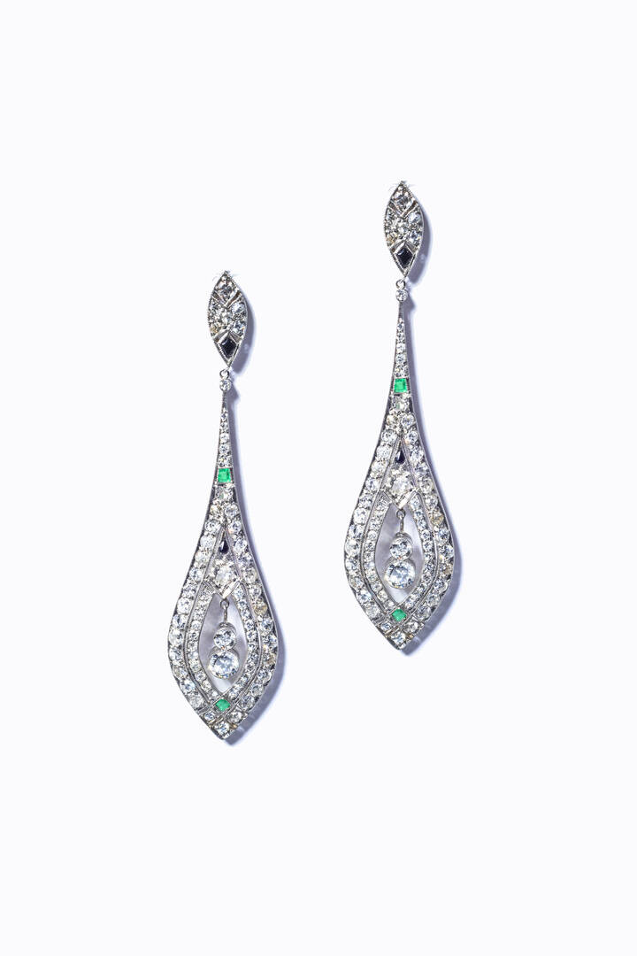 Peso gr 12 in oro bianco in stile anni '20 con gocce pendenti in diamanti taglio brillante di vecchio taglio e 8/8 per totali ct 4 0 ca inserti in onice e piccoli smeraldi a decoro