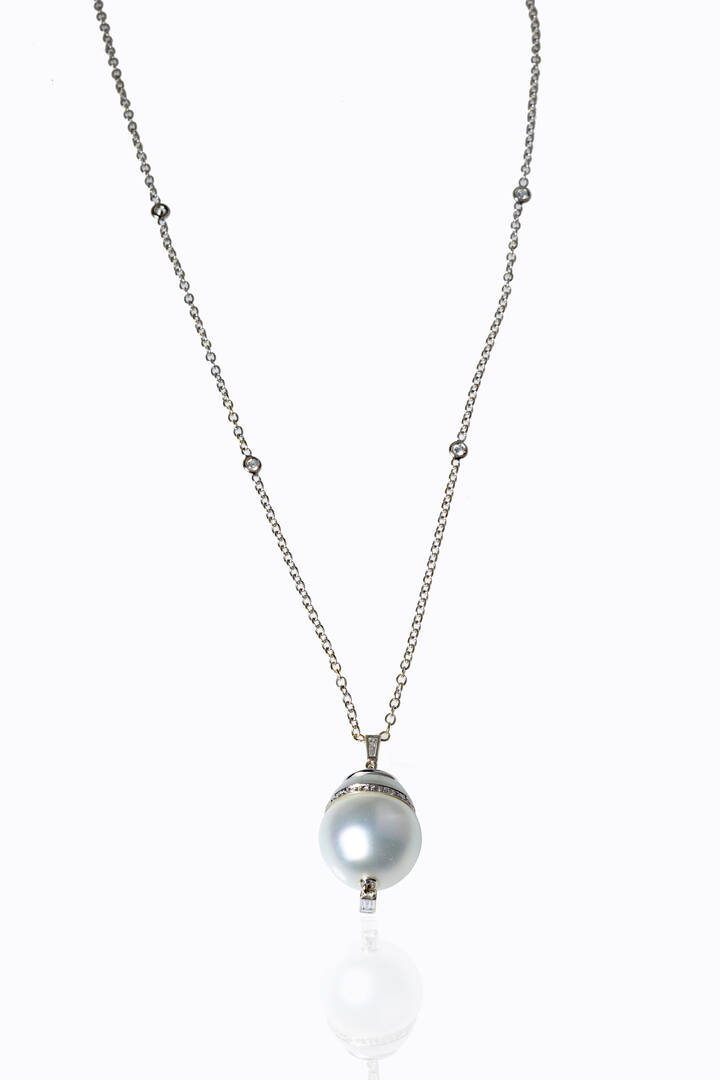 Peso gr 13 8 in oro bianco con perla australiana a pera; al centro fila di diamanti [..]