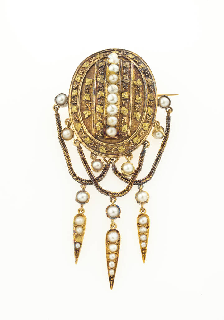 Peso gr 16 1 XIX secolo in oro 9 Kt di forma ovale con frange recanti perline (una mancante)
