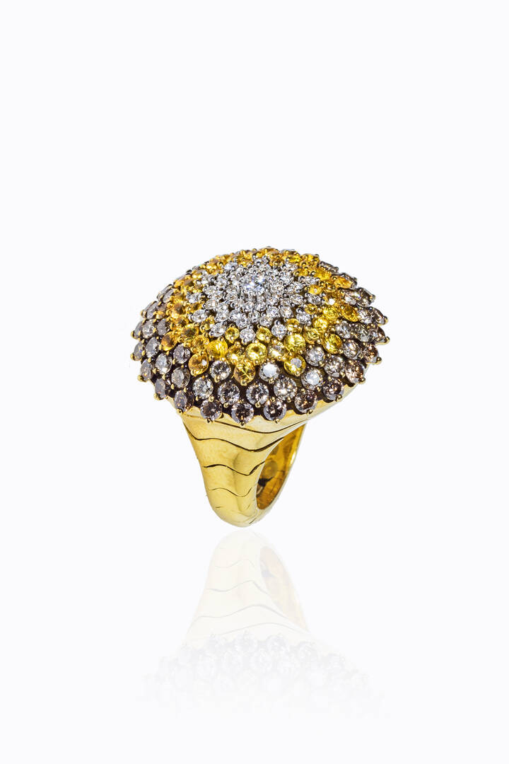 Peso gr 17 1 Misura 15 (55) in oro giallo sommità rotonda con file di diamanti taglio brillante di colore bianco e brown per totali ct 2 96 ca probabile colore G-H purezza IF-VVS; file di zaffiri gialli per totali ct 1 56 ca