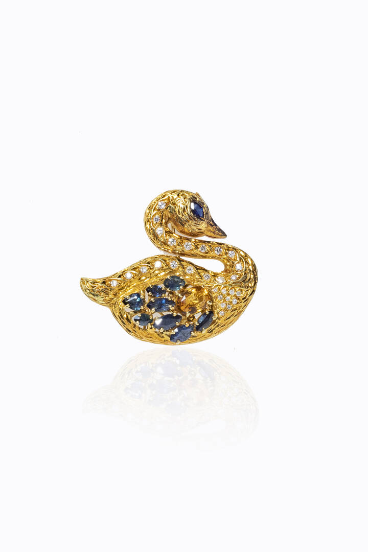 Peso gr 17 Cm 3 5x4 in oro giallo a forma di cigno con zaffiri taglio navette per totali ct 2 50 ca un quarzo citrino e diamanti taglio 8/8 per totali ct 0 55 ca